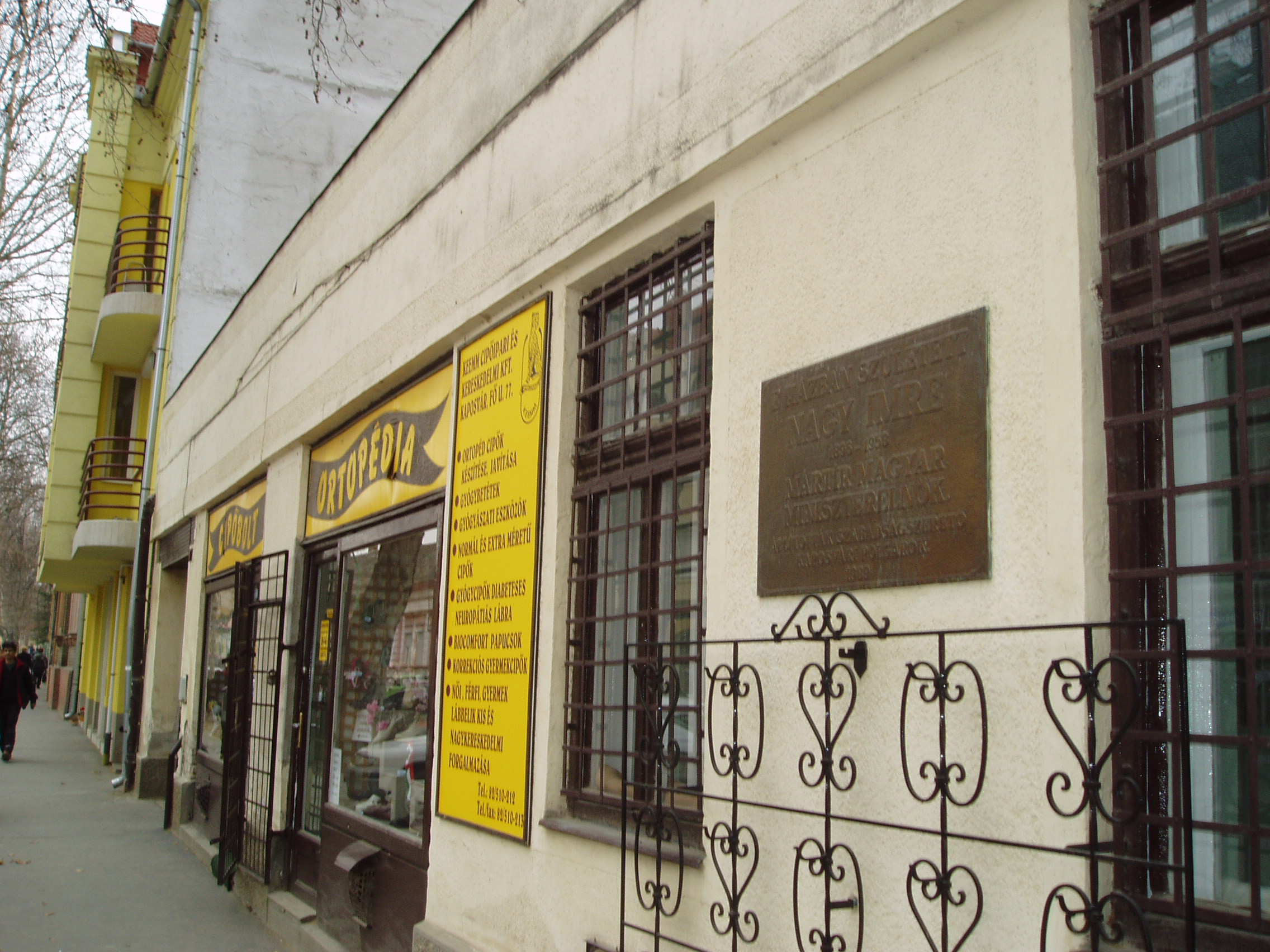 Nyilvános 1528 | 2506 | Kaposvár, Fő utca 77. | Kaposvár hosszú főutcájának a városközponttól távolabbi részén ma is álló kis házban született Nagy Imre mártír miniszterelnök 1896. június 7-én. Emléktábláját 1989-ben, rehabilitálásának évében helyezték el. 1996-ban, a forradalom 40. évfordulójára szobrot is állítottak emlékére a Megyeháza előtt, az 56-os emlékmű mellett (Paulkovics István alkotása). Nagy Imre református szegényparaszti családból származott. Apja postai szerelőmunkás volt. Anyja, mielőtt férjhez ment volna, a somogyi alispánnál cselédlányként szolgált. Tanulmányait a 4 elemi (lásd: Kaposár, Fő u. 44.) és a 4 polgári osztályig végezte, mert 1912-ben saját elhatározásból elhagyta kaposvári gimnáziumot és géplakatos segédnek állt. A segédi oklevelet 1914-ben szerzete meg, majd a tanulmányait folytatandó beiratkozott a kaposvári felső kereskedelmi iskolába. Ezt már nem tudta elvégezni, mert 1915 májusában behívták katonának. A Monarchia katonájaként 1918-ban az orosz fronton fogságba esett. Politikai pályafutása ekkoriban kezdődött el. A fénykép 2006 márciusában készült. Felh. irod.: Látnivalók Somogy megyében. Miskolc, Well-PRess, 2000 hu.wikipedia.org/wiki/Nagy Imre |