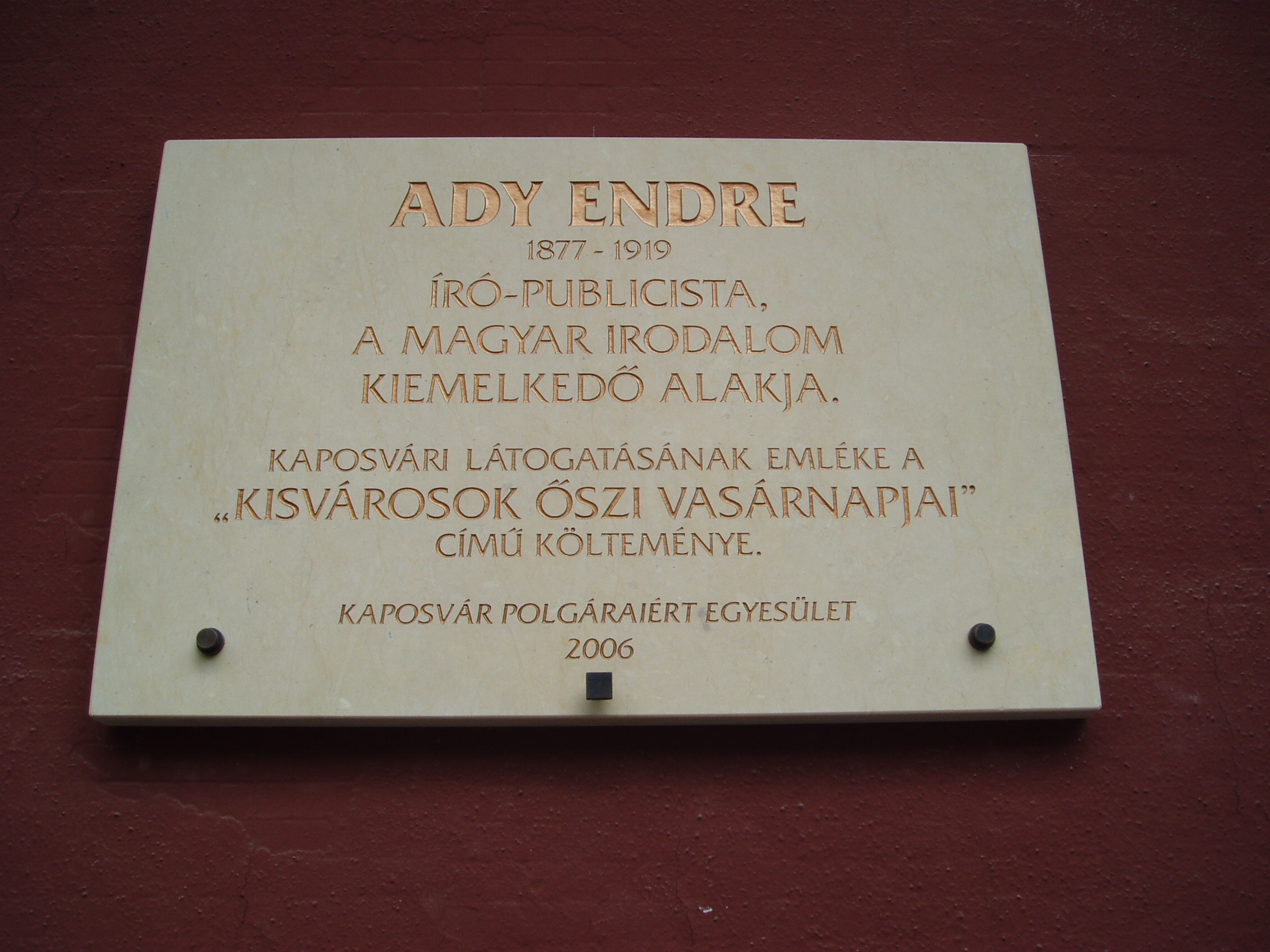 Nyilvános 1590 | 2396 | Kaposvár, Ady utca 2. | A város szívében, a mai Kapos szálloda helyén egykor urasági szálloda állott, amelyet Koronának neveztek. 1860 körül jelentősen bővítették az épületet, majd 1912-ben részben lebontották és teljesen átalakították. A mai jellegtelen épület elődeivel építészetileg semmilyen rokonságot nem mutat. Jelenleg Kapos Szálló néven működik. Egy szöveges és egy domborműves tábla Ady Endre emlékét idézi, aki egykor a Koronában tartott felolvasóestet és itteni élményei alapján írta a „Kisvárosok őszi vasárnapjai” című versét. A XIX. század közepétől a szálloda a város társadalmi és kulturális központja volt. Az 1860-as, 1870-es években, a téli időszakban — állandó színház hiányában — általában itt léptek fel a városba látogató színtársulatok. Itt (is) muzsikált Szimplicisszimusz, a világot járt híres cigányprímás, akit Ausztriából 1872-ben hívtak haza, Kaposvárra. Vendégszerepelt itt zenekarával 1895 nyarán Dankó Pista. A fénykép 2006 márciusában készült. Felh. irod.: Zádor Mihály: Kaposvár. Bp. Műszaki Kiadó, 1964 Látnivalók Somogy megyében. Miskolc, Well-PRess, 2000 |