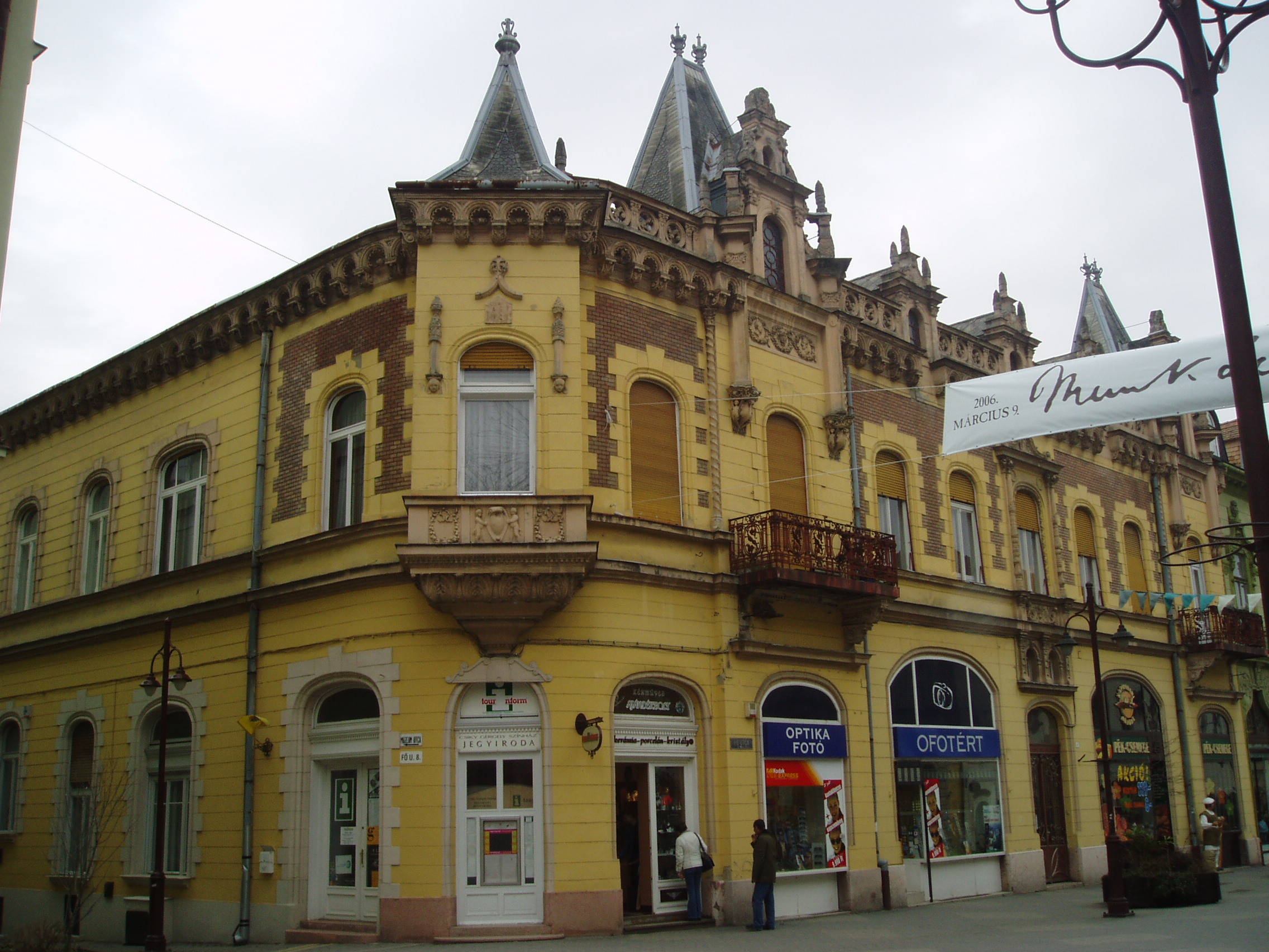 Nyilvános 1419 | 2038 | Kaposvár, Fő utca 8. | Kaposvár belvárosának épületeit nagyrészt a XIX. század második felében és a XX. század első két évtizedében emelték. A döntően eklektikus és kisebb számban szecessziós stílusú épületek nem képviselnek kiemelkedő építészeti értéket, de együttesen sajátos hangulatú utcaképet alkotnak. A Fő utca 8. számú egykori Kemény-palota, a sétálóutca ékessége neoreneszánsz stílusban Kovács Frigyes tervei szerint épült 1904-ben. A fénykép 2006 márciusában készült. Felh. irod.: Kaposvár és környéke. Kaposvár, Infomark, 2002 Látnivalók Somogy megyében. Miskolc, Well-PRess, 2000 /Vendégváró/ |
