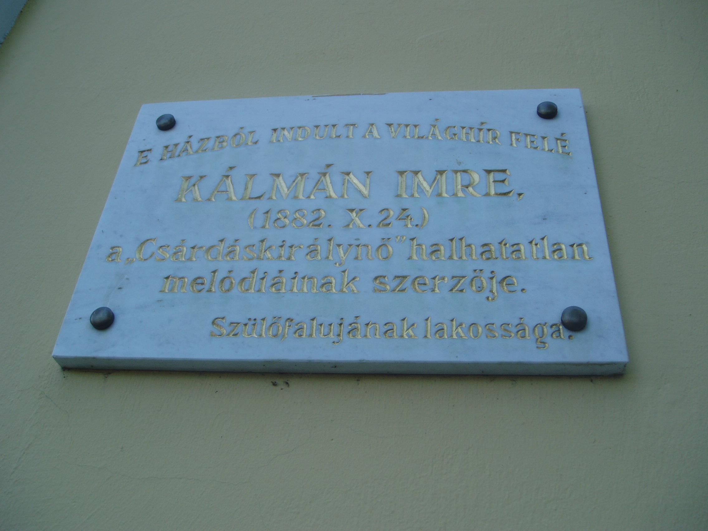 Nyilvános 1503 | 2367 | Siófok, Kálmán Imre sétány 5. | Ebben a vasútállomáshoz közeli házban született 1882-ben a magyar operett egyik legjelentősebb zeneszerzője, Kálmán Imre. Születése napja bizonytalan, még a család sem tudta eldönteni, hogy október 24-én, vagy 25-én jött-e a világra. Édesapja Koppstein Károly Siófokon gabonakereskedő és vállalkozó volt. Édesanyja Singer Paula - szelíd, művészlelkű asszony - megérte fia világhírét. Kálmán Imre a harmadik gyerekként született. Nevét később, a gimnáziumi évek alatt magyarosította Kálmánra. A kis Imre korán tanújelét adta zenei érdeklődésének, tehetségének, amit a családból hozott magával: felmenői között anyai ágon muzsikusok, apai ágon kiváló rabbik, tanítók voltak. Még nem volt hat éves, amikor egy nyáron náluk vett ki szobát Liedl Ferenc hegedűművész, tőle kapott először a kisfiú zenei leckéket. Gyermekként járt először színházban is, a házuk közvetlen szomszédságában egykor állott Nyári Színkörben (lásd: Siófok, Kálmán Imre sétány 6.). Elemi iskolai tanulmányait az egytanerős izraelita népiskolában végezte. Első hivatásos zenetanára még elemista korában a helybeli Remcsák Antal volt. Elemi iskoláinak befejeztével Budapesten tanult tovább a Deák téri Evangélikus Főgimnáziumban. Közben édesapja üzleti vállalkozásai teljesen tönkrementek, mindenüket elárverezték, s a család elhagyta Siófokot. Kálmán Imre a budapesti Zeneakadémián végzett tanulmányai mellett családi követelésre jogot is hallgatott. S bár a Zeneakadémián — ahol évfolyamtársa volt például Bartók Béla — még szimfóniákról álmodott, operettszerzőként lett világhírű. Siófoki szülőházában — amelyet először 1955-ben jelöltek meg emléktáblával — 1970-ben özvegye, Kálmán Vera jelenlétében avattak emlékszobát. A mostani, gazdagabb anyagú emlékmúzeumot a zeneszerző születésének 105. évfordulója alkalmából, 1987. október 22-én nyitották meg. Jelenleg az emlékmúzeum a szülőház földszinti termeiben található, az emeleten kortárs képzőművészeti időszaki kiállításokat szoktak rendezni. A fénykép 2006 júliusában készült. Felh. irod.: Kálmán Imre Múzeum Siófok. Szerk. Koch József. Siófok, 2000 http://www.kalmanimre-muzeum.hu/ |