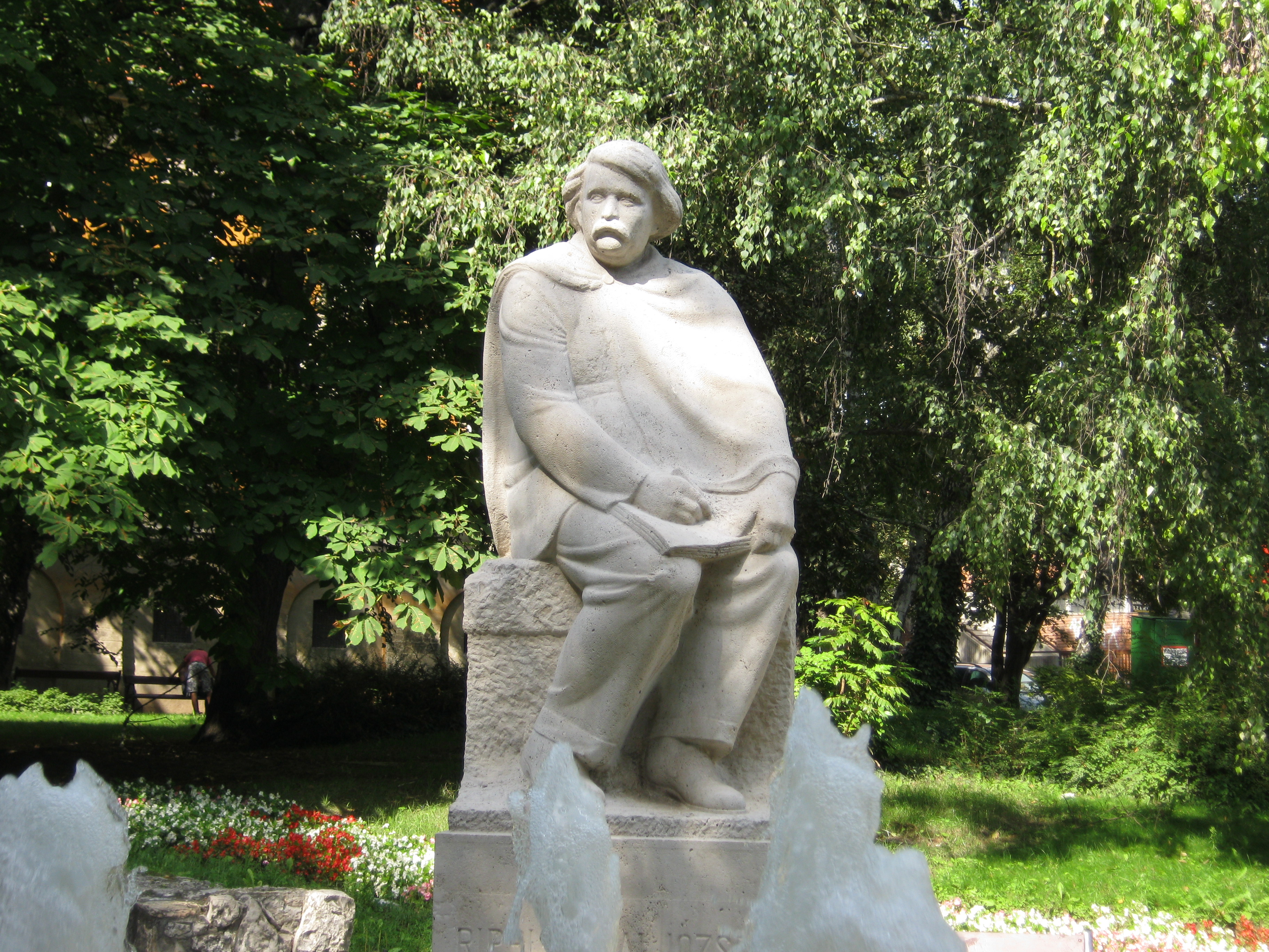 Nyilvános 1428 | 2307 | Kaposvár, Rippl-Rónai tér: Rippl-Rónai József szobra | Medgyessy Ferenc 1930-ban készített szobrát 1950-ben állították fel a festőművészről elnevezett téren. A posztimpresszionista és szecessziós törekvések legkiemelkedőbb magyarországi képviselőjeként számon tartott Rippl-Rónai József eredetileg Kaposváron patikussegédnek tanult (lásd: Kaposvár, Fő u. 19.). Művészi munkássága Párizsban, Munkácsy Mihály tanítványaként bontakozott ki. 1902-ben visszatért Kaposvárra, az I. világháború kitörése azonban ismét Párizsban érte, ahol elfogták és internálták. 1915-ben ismét visszatért a szülővárosába, és haláláig a jelenleg múzeumként látogatókat fogadó Róma-villa (lásd: Kaposvár, Róma hegy) volt az otthona. A fénykép 2010 augusztusában készült. |