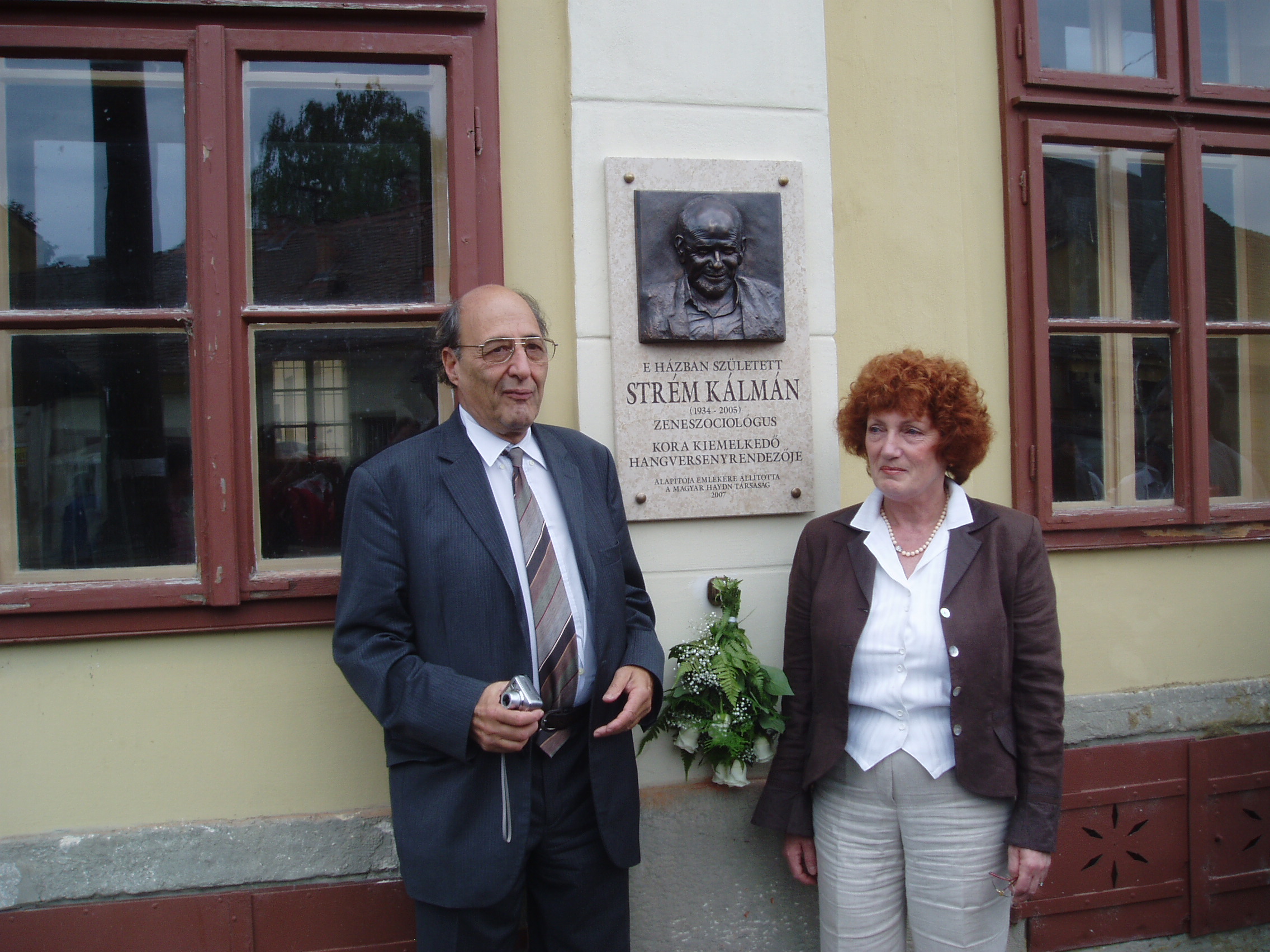 Nyilvános 2543 | 5479 | Strém Kálmán emléktáblájának felavatása 2007. május 28-án Nagykanizsán, Erzsébet tér 11. számú szülőházán. A táblát a Magyar Haydn Társaság állította, az eseményt a Kanizsai Klasszikusok Kulturális és Közhasznú Alapítvány rendezte. | A képen Strém Kálmán öccse és dr. Gerő Katalin, az emléktábla alkotója. Strém Kálmán (1934-2005) zeneszociológus, hangversenyrendező, a legjelentősebb hazai koncertrendező iroda vezetője 1934. május 23-án született Nagykanizsán az Erzsébet tér 11. számú épületben, az ún. Gutmann–palotában. Évtizedekig tevékenykedett az Országos Filharmóniánál, ahol a vidéki osztály vezetőjeként felbecsülhetetlen értékű munkát végzett. 1978-ban a Zeneművész Szövetség ügyvezető titkára lett, ezen a posztján húsz évig tevékenykedett. Közben olyan, a magyar zenei élet húsbavágó kérdéseiről publikált nagyhatású könyveket, mint a Hol vannak a magyar vonósok?, a Lemorzsolódás a zeneiskolákban és a Vitairat a magyar zenei művelődésről. A magyar zenei élet jobbítására közreadott javaslatai közül a — mára sajnos megszüntetett — zenei menedzserképzést ő indíthatta el a Zeneakadémián. A menedzselést nemcsak tanította, hanem a rendszerváltást követően maga is vállalkozni kezdett, s létrehozta a Strém Koncert Kft.-t, amely hamarosan a legnagyobb nem állami hangversenyrendező irodává vált. Strém Kálmán e minőségében is példamutató, áldozatos munkát végzett. Tevékenységének egyik fő iránya a magyarországi Haydn–kultusz erősítése volt: megszervezte és működtette a Fertőd–Eszterházai Nyári Fesztiválokat. Hangversenyrendezői munkájának másik pólusán a kortárs zene állott: ő hívta életre Balatonföldváron a Földvári Zenei Napokat, ahol igaz összművészeti kulturális műhelyt hozott létre (sajnos, mára ez a rendezvénysorozat is megszűnt). Hangversenyeit mindig a legnagyobb gondossággal, európai ízléssel rendezte meg. S bár ő maga nem volt muzsikus, de — mint egy tisztelője megfogalmazta — a hangversenyrendezést művészi fokon művelte. 2005. november 27-én bekövetkezett hirtelen halálával egy korszak zárult le a magyar zenei életben. Batta András, a Zeneakadémia rektora a következő szavakkal méltatta őt: "Olyan fajta ember volt, akiről azt hittük soha nem öregedik meg és nem fárad el. Élete volt a zene és a zene közvetítése. Évente százával szervezett, rendezett hangversenyeket, állt ki jó ügyek mellett, fedezett fel fiatal tehetségeket, adta meg a tiszteletet idős művészeknek." Halála óta már két emléktáblát avattak tiszteletére: Székesfehérváron a Szent István Művelődési Központban és a budapesti Liszt Ferenc Zeneművészeti Egyetemen. Most nagykanizsai szülőházára került fel emléktábla, az emlékező beszédet Malina János zenetörténész, a Magyar Haydn Társaság elnöke tartotta. Az eseményt — természetesen — hangverseny is követte a Jézus Szíve templomban, amelyen Földes Imre tanár úr idézte fel Strém Kálmán alakját a közönség előtt. A hangversenyen közreműködtek: Horváth Anikó (csembaló), Kelemen Barnabás (hegedű), Kokas Katalin (hegedű és brácsa), Kokas Dóra (cselló). |
