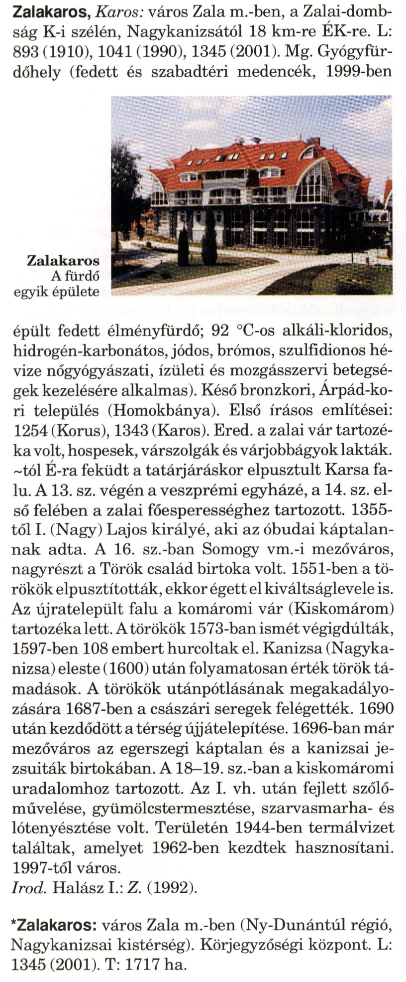 Nyilvános 2030 | 3661 | Rövid leírás | Teljes leírás (3.57 KB) | A szócikkek felismertetett szövege: (A csillag után a kiegészítő kötetből származó szöveg következik) Zalakaros, Karos: város Zala m.-ben, a Zalai-dombság K-i szélén, Nagykanizsától 18 km-re ÉK-re. L: 893 (1910), 1041 (1990), 1345 (2001). Mg. Gyógyfür-dőhely (fedett és szabadtéri medencék, 1999-ben épült fedett élményfürdő; 92 °C-os alkáli-kloridos, hidrogén-karbonátos, jódos, brómos, szulfidionos hévize nőgyógyászati, ízületi és mozgásszervi betegségek kezelésére alkalmas). Késő bronzkori, Árpád-kori település (Homokbánya). Első írásos említései: 1254 (Korus), 1343 (Karos). Ered. a zalai vár tartozéka volt, hospesek, várszolgák és várjobbágyok lakták. ~tól É-ra feküdt a tatárjáráskor elpusztult Karsa falu. A 13. sz. végén a veszprémi egyházé, a 14. sz. első felében a zalai főesperességhez tartozott. 1355-től I. (Nagy) Lajos királyé, aki az óbudai káptalannak adta. A 16. sz.-ban Somogy vm.-i mezőváros, nagyrészt a Török család birtoka volt. 1551-ben a törökök elpusztították, ekkor égett el kiváltságlevele is. Az újratelepült falu a komáromi vár (Kiskomárom) tartozéka lett. A törökök 1573-ban ismét végigdúlták, 1597-ben 108 embert hurcoltak el. Kanizsa (Nagykanizsa) eleste (1600) után folyamatosan érték török támadások. A törökök utánpótlásának megakadályozására 1687-ben a császári seregek felégették. 1690 után kezdődött a térség újjátelepítése. 1696-ban már mezőváros az egerszegi káptalan és a kanizsai jezsuiták birtokában. A 18—19. sz.-ban a kiskomáromi uradalomhoz tartozott. Az I. vh. után fejlett szőlőművelése, gyümölcstermesztése, szarvasmarha- és lótenyésztése volt. Területén 1944-ben termálvizet találtak, amelyet 1962-ben kezdtek hasznosítani. 1997-től város. Irod. Halász I.: Z. (1992). *Zalakaros: város Zala m.-ben (Ny-Dunántúl régió, Nagykanizsai kistérség). Körjegyzőségi központ. L: 1345 (2001). T: 1717 ha. A szócikkek a következő lexikonból származnak: Cím: Magyar nagylexikon Közreműködő: Élesztős László (1949) (szerk.) ; Barabás Éva (1943) (szerk.) ; Berényi Gábor (1946) (szerk.) ; Bárány Lászlóné (szerk.) ; Adelmann-né Kertész Judit (1945) (közrem.) ; Froemel Károlyné Jáky Éva (1936) (közrem.) ; Akadémiai Kiadó és Nyomda Vállala Szerz. közl.: [... Élesztős László főszerk.] ; [szerk. Barabás Éva et al.] ; [bibliogr. Adelmanné Kertész Judit] ; [kész. az Akadémiai Kiadó Magyar Nagylexikon Szerkesztőségében] Kiadás: Budapest : Akad. K., 1993- Kötetei: 1. köt., A - Anc 2. köt., And - Bag 3. köt., Bah - Bij 4. köt., Bik - Bz 5. köt., C - Csem 6. köt., Csen - Ec 7. köt., Ed - Fe 8. köt., Ff - Gyep 9. köt., Gyer - Iq 10. köt., Ir - Kip 11. köt., Kir - Lem 12. köt., Len - Mep 13. köt., Mer - Nyk 14. köt., Nyl - Pom 15. köt., Pon - Sek 16. köt., Sel - Szö 17. köt., Szp - Ung 18. köt., Unh - Z 19. köt., Kiegészítő kötet, A - Z ETO jelzet: 030=945.11 Szakjelzet: 030 Cutter: M 14 ISBN: 963-05-6611-7 [!ISBN 963-05-6615-X] Nyelv: magyar Megjegyzés: Az 5. kötettől kiad. a Magyar Nagylexikon Kiadó ; A 6. kötettől főszerk. Berényi Gábor ; A 6. kötettől szakszerk. Bárány Lászlóné et al. ; A 6. kötettől bibliogr. Froemel Károlyné ; Bibliogr. a szócikkek végén |