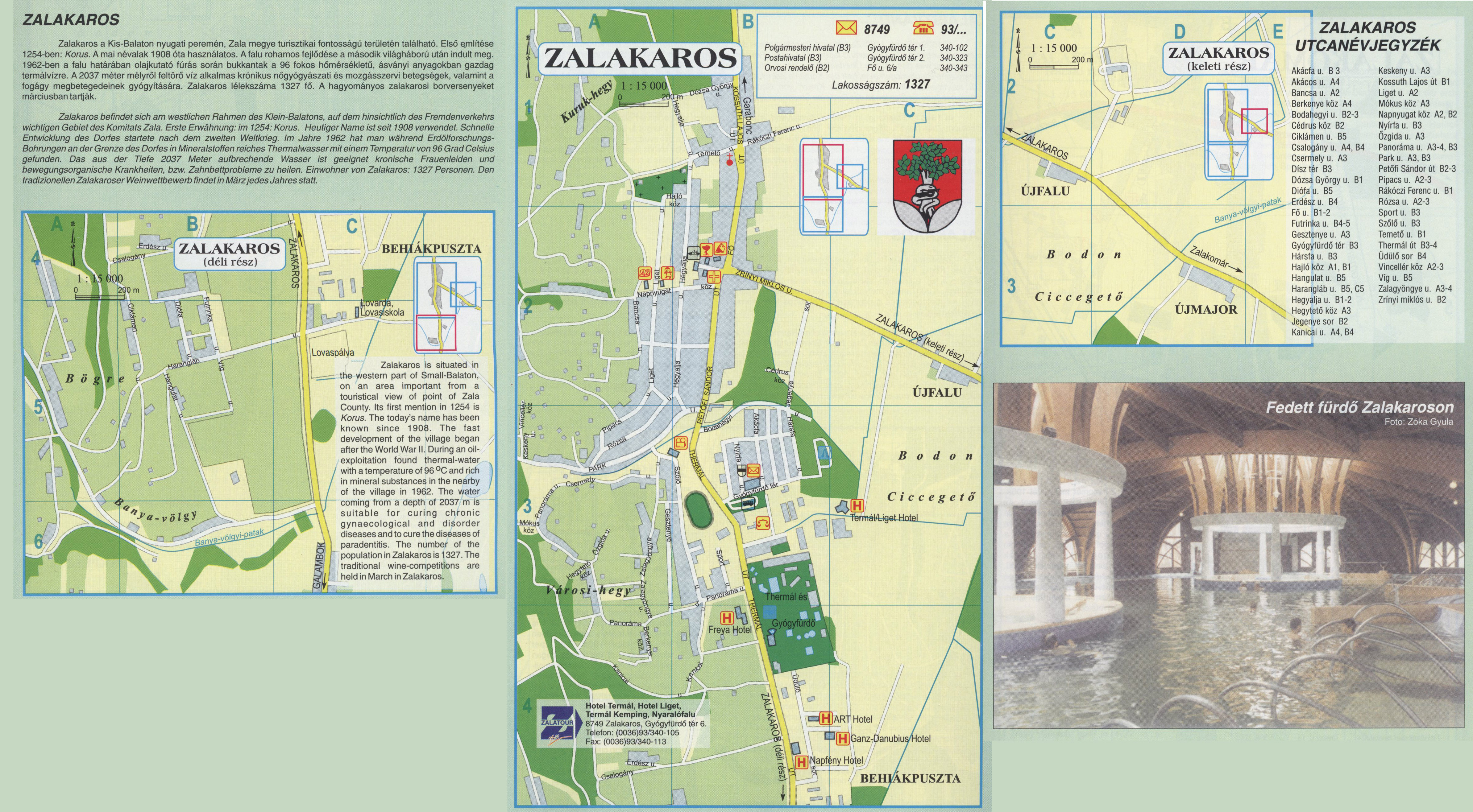Nyilvános 2402 | 7090 | ZALAKAROS | Zalakaros a Kis-Balaton nyugati peremén, Zala megye turisztikai fontosságú területén található. Első említése 1254-ben: Korus. A mai névalak 1908 óta használatos. A falu rohamos fejlődése a második világháború után indult meg. 1962-ben a falu határában olajkutató fúrás során bukkantak a 96 fokos hőmérsékletű, ásványi anyagokban gazdag termálvízre. A 2037 méter mélyről feltörő víz alkalmas krónikus nőgyógyászati és mozgásszervi betegségek, valamint a fogágy megbetegedéseinek gyógyítására. Zalakaros lélekszáma 1327 fő. A hagyományos zalakarosi borversenyeket márciusban tartják. Zalakaros befindet sich am westlichen Rahmen des Klein-Balatons, auf dem hinsichtlich des Fremdenverkehrs wichtigen Gebiet des Komitats Zala. Erste Erwähnung: im 1254: Korus. Heutiger Name ist seit 1908 verwendet. Schnelle Entwicklung des Dorfes startete nach dem zweiten Weltkrieg. Im Jahre 1962 hat man während Erdölforschungs-Bohrungen an der Grenze des Dorfes in Mineralstoffen reiches Thermalwasser mit einem Temperatur von 96 Grad Celsius gefunden. Das aus der Tiefe 2037 Meter aufbrechende Wasser ist geeignet kronische Frauenleiden und bewegungsorganische Krankheiten, bzw. Zahnbettprobleme zu heilen. Einwohner von Zalakaros: 1327 Personen. Den tradizionellen Zalakaroser Weinwettbewerb findet in März jedes Jahres statt. Zalakaros is situated in the western part of Small-Balaton, on an area important from a touristical view of point of Zala County. Its first mention in 1254 is Korus. The today\'s name has been known since 1908. The fast development of the village began after the World War II. During an oil-exploitation found thermal-water with a temperature of 96 °C and rich in mineral substances in the nearby of the village in 1962. The water coming from a depth of 2037 m is suitable for curing chronic gynaecological and disorder diseases and to cure the diseases of paradentitis. The number of the population in Zalakaros is 1327. The traditional wine-competitions are held in March in Zalakaros. A részlet a következő kiadványból származik/Die Teile stammen vom volgenden Buch/This text came from the following book: Cím/Titel/Title: Zala megye településeinek atlasza - 257 település részletes térképe/Atlas der Komitat Zala - 257 Detailte Siedlungskarten/Zala county\'s Atlas - 257 settlement maps. Közreműködő/contributor: Lackner László (1943) (fotó) Kiadás/Ausgabe/Publisher: Gyula : HISZI-MAP, 1997 Sorozat/Serie/Series: Indulástól - megérkezésig... ETO: 912(439.121-2) ; 908.439.121 Cutter: Z 19 ISBN: 963-610-025-4 Oldalszám/Seiten/Pages: 323, 81 p. Megjegyzés/Note: Lezárva/Abgeschlossen am/Closed am: 1997. máj. 30. |
