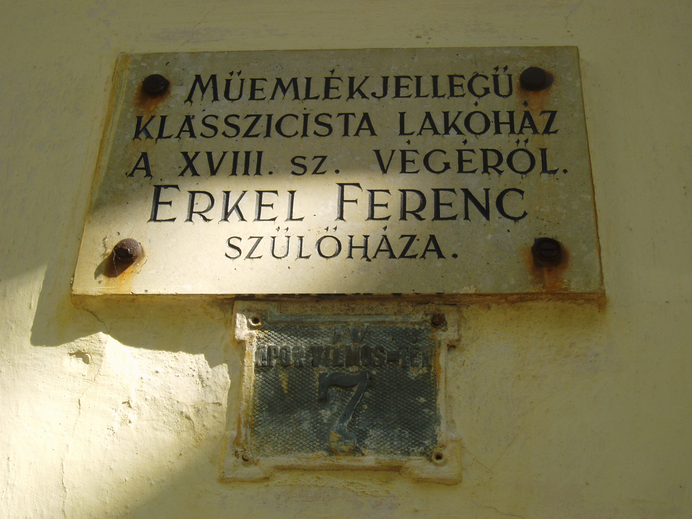 Nyilvános 1783 | 3422 | Gyula, Apor tér 7. Erkel Ferenc szülőháza | A földszintes, klasszicista jellegű németgyulai iskola és kántortanítói lakás 1795-ben épült. Az L alakú épület Apor térre néző szárnya volt az iskola, a Dürer utcára néző pedig a tanítói lakás, melynek ablakai közül kettő a térre néz. Ebben a házban született 1810. november 7-én Erkel Ferenc a németgyulai tanító fiaként, s testvéreivel együtt itt nevelkedett szeretetteljes családi légkörben. Első zenei tanítója remekül muzsikáló édesapja volt. Már néhány héttel Erkel halála után, 1893. július 5-én a házat emléktáblával jelölték meg, amelyet 1910-ben, születésének centenáriumán a most is látható díszesebbre cserélték. A korábbi tantermek helyén először 1960-ban rendeztek kiállítást, majd 1970-ben nyílt meg az Erkel Ferenc Emlékmúzeum. 1985-ben kibővítették, múzeumnak rendezték be az eredeti tanítói lakás helyiségeit is, köztük azt a sarokszobát, amelyben Erkel született. Az Emlékház gyűjteményében megtekinthetőek az Erkel család relikviái, s itteni életkörülményeikbe is bepillanthat a látogató. A fénykép 2007 júliusában készült. Felh. irod.: Czeglédi Imre: Gyula útikalauz. 2. bőv. kiad. Gyula, 1995 Czeglédi Imre: Erkel Ferenc Emlékház /Tájak, korok, múzeumok 238./ Németh Csaba: A gyulai Erkel Ferenc Múzeum Erkel–gyűjteménye. Gyula, 2007. /Gyulai katalógusok 12./ |
