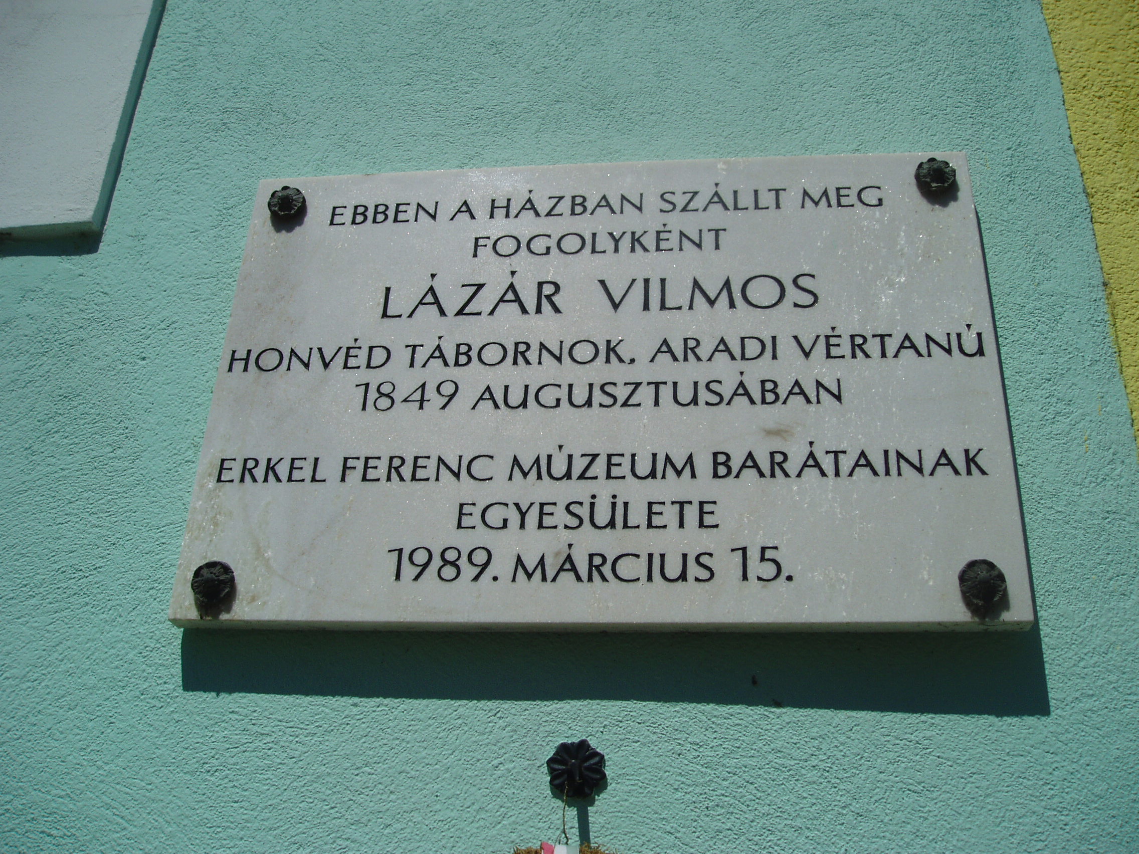 Nyilvános 1356 | 1901 | Gyula, Kossuth utca 18. | 1849 augusztusában ebben a lakóházban szállt meg fogolyként Lázár Vilmos honvéd ezredes, aradi vértanú. A szabadságharc tragikus gyulai eseményét lásd: Gyula, Várkert: Honvédtiszti emlékhely. A fénykép 2007 júliusában készült. Felh. irod.: Czeglédi Imre: Gyula útikalauz. 2. jav., bőv. kiad. Gyula, 1995 |
