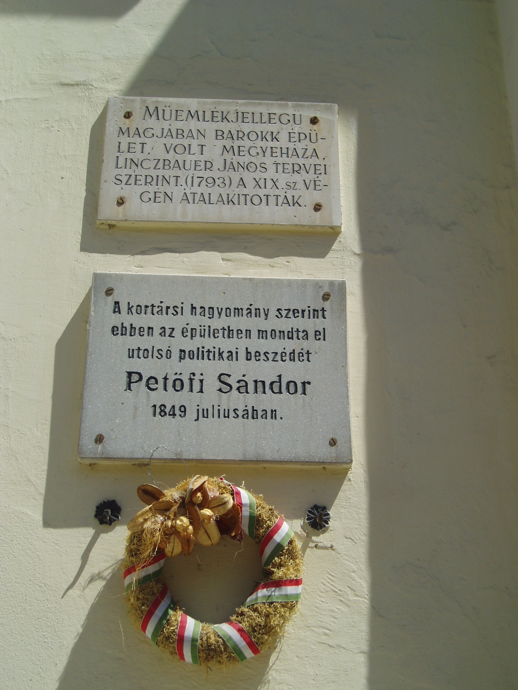 Nyilvános 1304 | 1742 | Gyula, Petőfi tér 3. Régi Vármegyeháza | A városközponti háromszög alakú hangulatos tér csaknem minden épülete történelmi vagy műemléki érték. Az egykori Vármegyeháza - a mai Városháza - a tér legszebb épülete. Eredeti formájában a XVIII. század utolsó harmadában épült az akkoriban újjátelepült Békés megye közigazgatási központjának. Azóta többszöri átépítéseket, alakításokat, bővítéseket hajtottak végre rajta. Ezek eredményeképpen ma barokk, klasszicista, romantikus és eklektikus részleteket egyaránt megfigyelhetünk az összességében eklektikus hatású épületen. A Vármegyeháza sok nevezetes eseménynek volt helyszíne. 1848. március 22-én az udvaron ismertették az egybegyűlt sokaság előtt a Pesten zajló eseményeket. A helyi hagyomány szerint 1849 júliusában a védbizottmány egyik ülésén mondta el utolsó politikai beszédét Petőfi Sándor. A költő akkoriban Mezőberényben tartózkodott, onnan rándult át a megyeszékhelyre. Az eseményt az épület homlokzatán emléktábla örökíti meg. A fénykép 2007 júliusában készült. Felh. irod.: Czeglédi Imre: Gyula útikalauz. 2. jav., bőv. kiad. Gyula, 1995 |