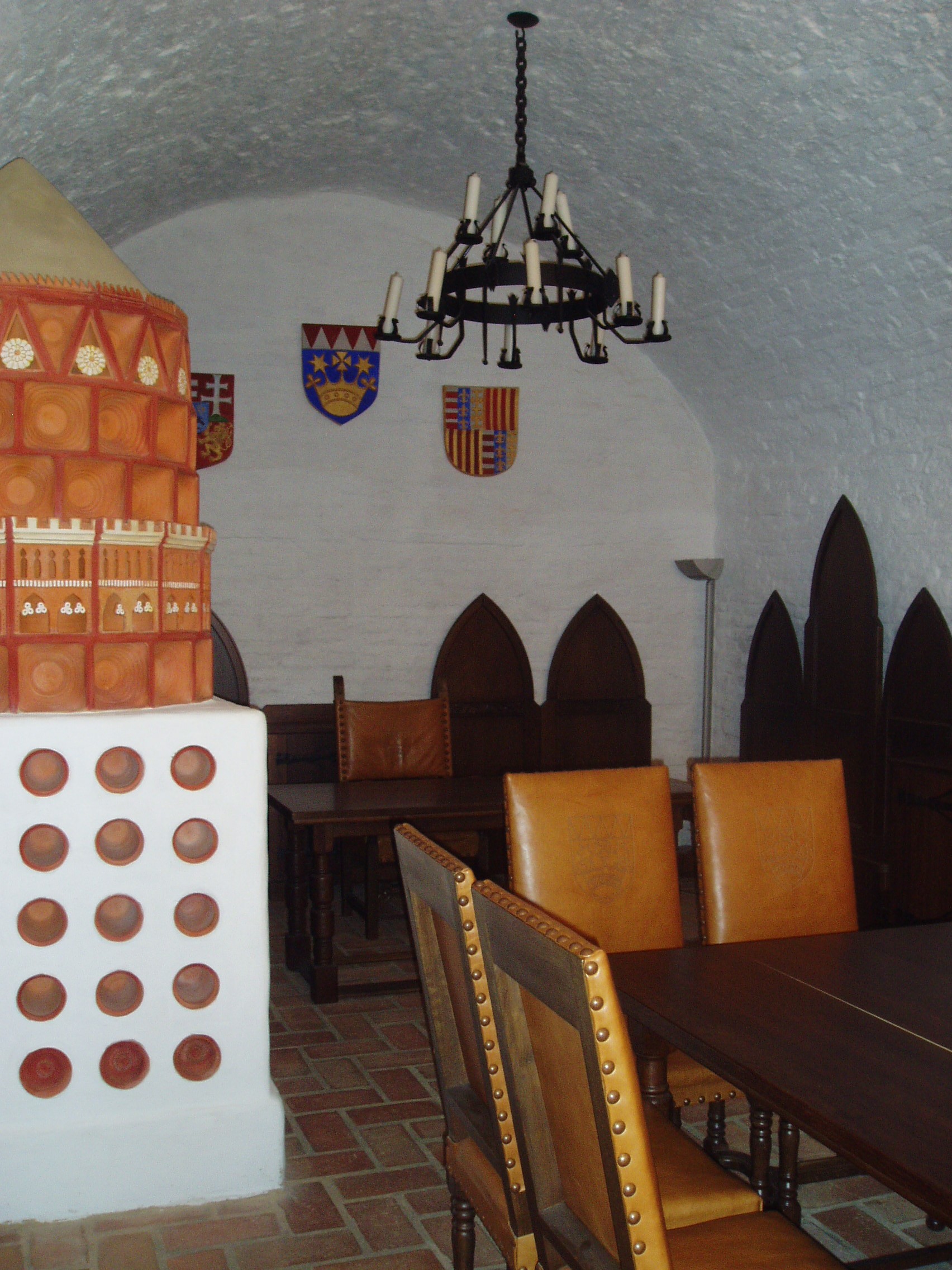 Nyilvános 1398 | 1904 | Gyula, Vár | A vár belső termeiben a közelmúltban nyílt meg a Vármúzeum. Berendezett termei és kápolnája igazi korabeli hangulatot nyújtanak a látogatóknak. A képen az emeleten található lovagterem részlete látható egy XVI. századi kályha rekonstrukciójával. A fénykép 2007 júliusában készült. |