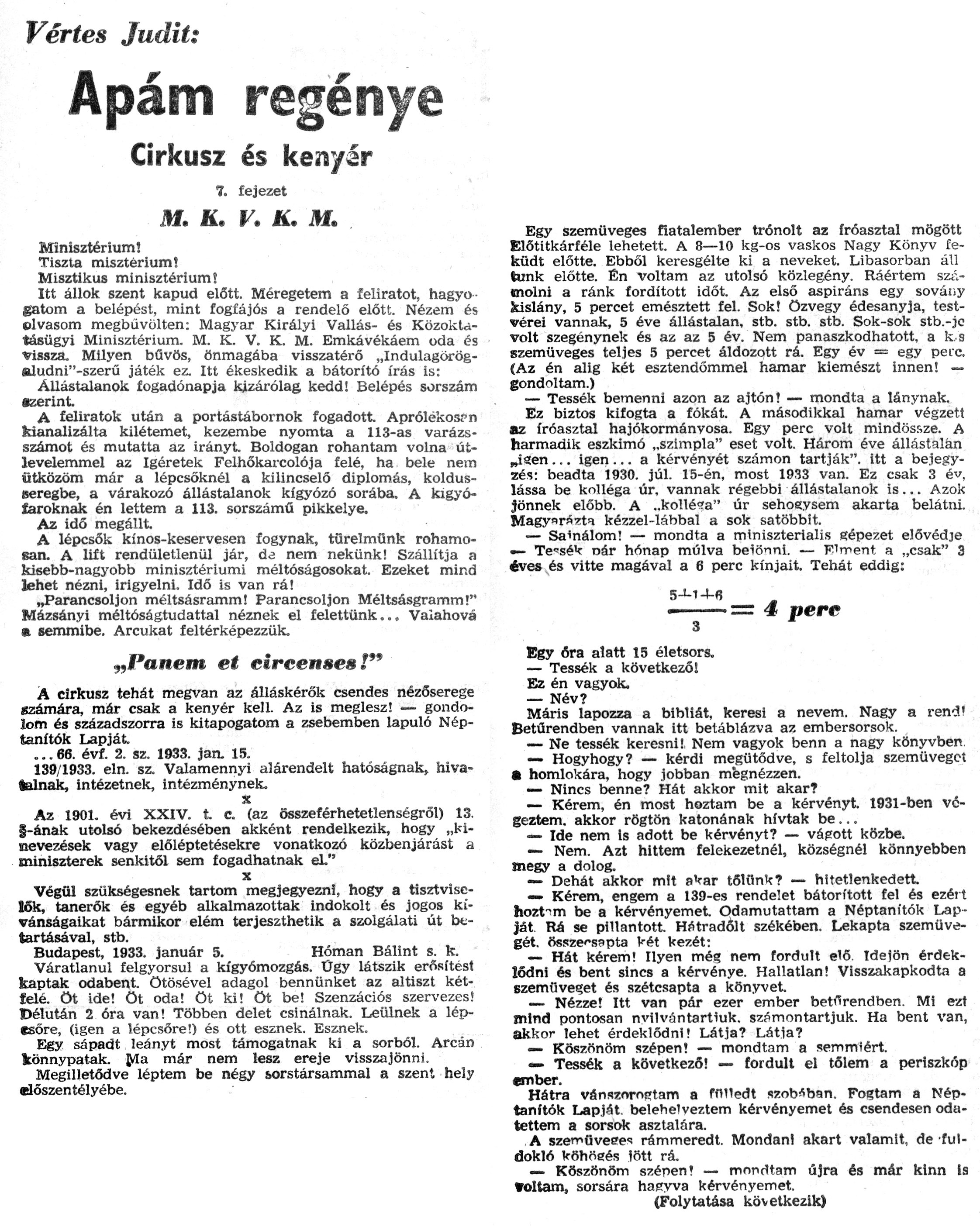 Nyilvános 1460 | 2359 | Zalai Hírlap 1971.02.14. 038sz 08old - Apám regénye 07 | A következő szöveg a cikkből keletkezett automata szövegfelismertető segítségével: Vértes Judit: Apám regénye Cirkusz és kenyér 7. fejezet M. K. V. K. M, Minisztérium! Tiszta misztérium! Misztikus minisztérium! Itt állok szent kapud előtt. Méregetem a feliratot, hagyó-gatom a belépést, mint fogfájós a rendelő előtt. Nézem és olvasom megbüvölten: Magyar Királyi Vallás- és Közoktatásügyi Minisztérium. M. K. V. K. M. Emkávékáem oda és vissza. Milyen bűvös, önmagába visszatérő „Indulagörög-aludni"-szerű játék ez. Itt ékeskedik a bátorító írás is: Állástalanok fogadónapja kizárólag kedd! Belépés sorszám szerint A feliratok után a portástábornok fogadott. Aprólékosan kianalizálta kilétemet, kezembe nyomta a 113-as varázsszámot és mutatta az irányt. Boldogan rohantam volna útlevelemmel az ígéretek Felhőkarcolója felé, ha bele nem ütközöm már a lépcsőknél a kilincselő diplomás, koldusseregbe, a várakozó állástalanok kígyózó sorába. A kigyó-íaroknak én lettem a 113. sorszámú pikkelye. Az idő megállt. A lépcsők kínos-keservesen fogynak, türelmünk rohamosan. A lift rendületlenül jár, da nem nekünk! Szállítja a kisebb-nagyobb minisztériumi méltóságosokat. Ezeket mind lehet nézni, irigyelni. Idő is van rá! „Parancsoljon méltsásramm! Parancsoljon Méltsásgramm!" Mázsányi méltóságtudattal néznek el felettünk... Valahová m semmibe. Arcukat feltérképezzük. „Panem et eircensea!" A cirkusz tehát megvan az álláskérők csendes nézőserege szamára, már csak a kenyér kell. Az is meglesz! — gondolom és századszorra is kitapogatom a zsebemben lapuló Néptanítók Lapját. ... 66. évf. 2. sz. 1933. jan. 15. 139/1933. eln. sz. Valamennyi alárendelt hatóságnak, hivatalnak, intézetnek, intézménynek. X Az 1901. évi XXIV. t c. (az összeférhetetlenségről) 13. §-ának utolsó bekezdésében akként rendelkezik, hogy „kinevezések vagy előléptetésekre vonatkozó közbenjárást a miniszterek senkitől sem fogadhatnak eL" x Végül szükségesnek tartom megjegyezni, hogy a tisztviselők, tanerők és egyéb alkalmazottak indokolt és jogos kívánságaikat bármikor elém terjeszthetik a szolgálati út betartásával, stb. Budapest, 1933. január 5. Hóman Bálint s. k. Váratlanul felgyorsul a kígyómozgás. Ügy látszik erősítést kaptak odabent, ötösével adagol bennünket az altiszt kétfelé. Öt ide! öt oda! Öt ki! öt be! Szenzációs szervezés! Délután 2 óra van! Többen delet csinálnak. Leülnek a léptsőre, (igen a lépcsőre!) és ott esznek. Esznek. Egy sápadt leányt most támogatnak ki a sorból. Arcán könnypatak. Jtfa már nem lesz ereje visszajönni. Megilletődve léptem be négy sorstársammal a szent hely élőszentélyébe. Egy szemüveges fiatalember trónolt az íróasztal mögött Előtitkárféle lehetett. A 8—10 kg-os vaskos Nagy Könyv feküdt előtte. Ebből keresgélte ki a neveket. Libasorban áll tünk előtte. Én voltam az utolsó közlegény. Ráértem számolni a ránk fordított időt. Az első aspiráns egy sovány kislány, 5 percet emésztett fel. Sok! özvegy édesanyja, testvérei vannak, 5 éve állástalan, stb. stb. stb. Sok-sok stb.-jo volt szegénynek és az az 5 év. Nem panaszkodhatott, a k.s szemüveges teljes 5 percet áldozott rá. Egy év = egy perc. (Az én alig két esztendőmmel hamar kiemészt innen! — gondoltam.) — Tessék bemenni azon az ajtón! — mondta a lánynak. Ez biztos kifogta a fókát. A másodikkal hamar végzett az íróasztal hajókormánvosa. Egy perc volt mindössze. A harmadik eszkimó „szimpla" eset volt. Három éve állástalán „isen ... igen ... a kérvényét számon tartják", itt a bejegyzés: beadta 1930. júl. 15-én, most 1933 van. Ez csak 3 év, lássa be kolléga úr, vannak régebbi állástalanok is... Azok jönnek előbb. A .,kollé?a" úr sehoeysem akarta belátni. Magyará^tq kézzel-lábbal a sok satöbbit. — Sa\'nálom! — mondta a miniszteriális gépezet elővédje •— Tcsék nár hónap múlva beiönni. — Elment a „csak" 3 éves és vitte magával a 6 perc kínjait. Tehát eddig: 5-M-M5 •------= 4 pere 3 Egy óra alatt 15 életsors. — Tessék a következő! Ez én vagyok. — Név? Máris lapozza a bibliát, keresi a nevem. Nagy a rend! Betűrendben vannak itt beláblázva az embersorsok. — Ne tessék keresni!, Nem vagyok benn a nagy könyvben. — Hogyhogy? — kérdi megütöd ve, s feltolja szemüveget • homlokára, hogy jobban mégnézzen. — Nincs benne? Hát akkor mit akar? — Kérem, én most hoztam be a kérvényt. 1931-ben végeztem, akkor rögtön katonának hívtak be... — Ide nem Is adott be kérvényt? — vágott közbe. — Nem. Azt hittem felekezetnél, községnél könnyebben megy a dolog. — Dehát akkor mit aVar tőlünk? — hitetlenkedett. — Kérem, engem a 139-es rendelet bátorított fel és ezért hoztam be a kérvényemet. Odamutattam a Néptanítók Lapját Rá se pillantott. Hátradőlt székében. Lekapta szemüvegét, összecsapta két kezét: — Hát kérem! Ilyen még nem fordult elő. Idefön érdeklődni és bent sincs a kérvénye. Hallatlan! Visszakapkodta a szemüveget és szétcsapta a könyvet. — Nézze! Itt van pár ezer ember betűrendben. Mi ezt mind pontosan nvilvántartiuk. számontartjuk. Ha bent van, akkor lehet érdeklődni! Látja? Látia? — Köszönöm szépen! — mondtam a semmiért. —■ Tessék a következő! — fordult el tőlem a periszkóp ember. Hátra vánszorojrtam a fflUedt szobiban. Fogtam a Néptanítók Lapját, belehe\'veztem kérvényemet és csendesen odatettem a sorsok asztalára. A szemOveee-! rámmeredt. Mondani akart valamit, de fuldokló köhögés főtt rá. — Köszönöm szépen! — mondtam újra és már kinn is Voltam, sorsára haeyv