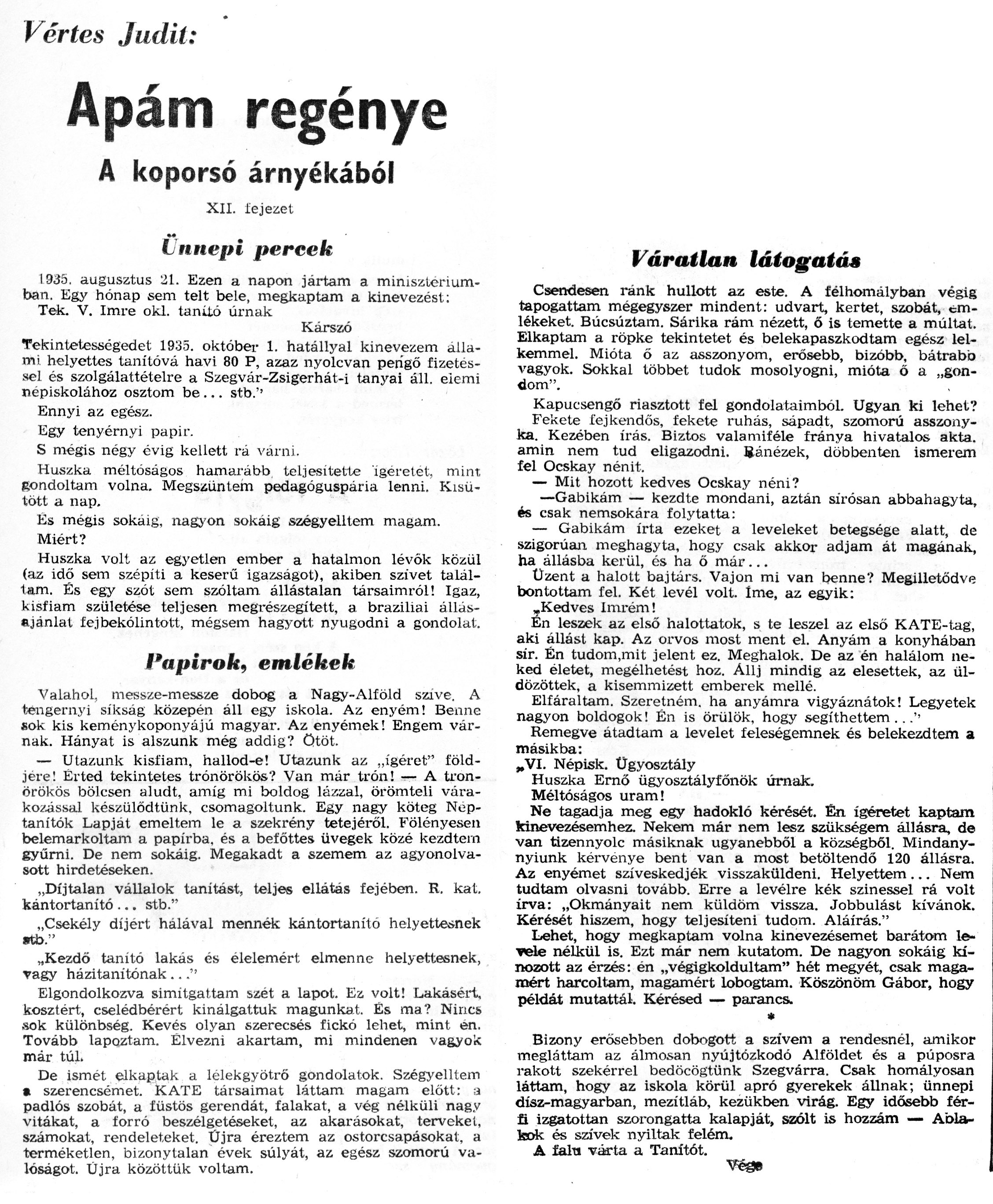 Nyilvános 1491 | 2463 | Zalai Hírlap 1971.03.21. 068sz 08old - Apám regénye 12 | A következő szöveg a cikkből keletkezett automata szövegfelismertető segítségével: Vértes Judit: Apám regénye A koporsó árnyékából XII. fejezet Ünnepi percek 1935. augusztus 21. Ezen a napon jártam a minisztériumban. Egy hónap sem telt bele, megkaptam a kinevezést: Tek. V. Imre oki. tanító úrnak Kárszó Tekintetességedet 1935. október 1. hatállyal kinevezem állami, helyettes tanítóvá havi 80 P, azaz nyolcvan pengő fizetéssel és szolgálattételre a Szegvár-Zsigerhát-i tanyai áll. elemi népiskolához osztom be... stb.\'1 Ennyi az egész. . . Egy tenyérnyi papir. S mégis négy évig kellett ra várni. Huszka méltóságos hamarább teljesítette ígéretet, mint gondoltam volna. Megszűntem pedagóguspária lenni. Kisütött a nap. És mégis sokáig, nagyon sokáig szégyelltem magam. Miért? Huszka volt az egyetlen ember a hatalmon lévók közül (az idő sem szépíti a keserű igazságot), akiben szivet találtam. És egy szót sem szóltam, állástalan társaimról! Igaz, kisfiam születése teljesen megrészegített, a braziliai állásajánlat fejbekólintott, mégsem hagyott nyugodni a gondolat. Papírok, emlékek Valahol, messze-messze dobog a Nagy-Alíöld szive. A tengernyi síkság közepén áll egy iskola. Az enyém! Benne sok. kis keménykoponyájú magyar. Az enyémek! Engem várnak. Hányat is alszunk még addig? ötöt. — Utazunk kisfiam, hallod-e! Utazunk az „ígéret" földjére! Érted tekintetes trónörökös? Van már trón! — A trónörökös bölcsen aludt, amíg mi boldog lázzal, örömteli várakozással készülődtünk, csomagoltunk. Egy nagy köteg Néptanítók Lapját emeltem le a szekrény tetejéről. Fölényesen belemarkoltam a papírba, és a beíőttes üvegek közé kezdtem gyűrni. De nem sokáig. Megakadt a szemem az agyonolvasott hirdetéseken. „Díjtalan vállalok tanítást, teljes ellátás fejében. R. kat. kántortanító ... stb." „Csekély díjért hálával mennék kántortanító helyettesnek «ü>." „Kezdő tanító lakás és élelemért elmenne helyettesnek, vagy házitanitónak ..." Elgondolkozva simitgattam szét a lapot. Ez volt! Lakásért, kosztért, cselédbérért kinálgattuk magunkat. És ma? Nincs sok különbség. Kevés olyan szerecsés fickó lehet, mint én. Tovább lapoztam. Élvezni akartam, mi mindenen vagyok már túl. De ismét elkaptak a lélekgyötrő gondolatok. Szégyelltem • szerencsémet. KATE társaimat láttam magam előtt: ;a padlós szobát, a füstös gerendát, falakat, a vég nélküli nagy vitákat, a forró beszélgetéseket, az akarásokat, terveket, számokat, rendeleteket. Üjra éreztem az ostorcsapásokat, a terméketlen, bizonytalan évek súlyát, az egész szomorú valóságot. Üjra közöttük voltam. Váratlan látogatás Csendesen ránk hullott az este. A félhomályban végig tapogattam mégegyszer mindent: udvart, kertet, szobát, emlékeket. Búcsúztam. Sárika rám nézett, ő is temette a múltat. Elkaptam a röpke tekintetet és belekapaszkodtam egész lel-kemmel. Mióta ő az asszonyom, erősebb, bizóbb, bátrabb vagyok. Sokkal többet tudok mosolyogni, mióta ő a „gondom". Kapucsengő riasztott fel gondolataimból. Ugyan ki lehet? Fekete fejkendős, fekete ruhás, sápadt, szomorú asszonyka. Kezében írás. Biztos valamiféle fránya hivatalos akta. amin nem tud eligazodni. Ránézek, döbbenten ismerem fel Ocskay nénit. — Mit hozott kedves Ocskay néni? —Gabikám — kezdte mondani, aztán sirósan abbahagyta, és csak nemsokára folytatta: — Gabikám írta ezeket a leveleket betegsége alatt, de szigorúan meghagyta, hogy csak akkor adjam át magának, ha állásba kerül, és ha ö már... Üzent a halott bajtárs. Vajon mi van benne? Megilletődve bontottam fel. Két levél volt. Íme, az egyik: ,Kedves Imrém! En leszek az első halottatok, s te leszel az első KATE-tag, aki állást kap. Az orvos most ment el. Anyám a konyhában sir. Én tudom.mit jelent ez. Meghalok. De az én halálom neked életet, megélhetést hoz. Állj mindig az elesettek, az üldözöttek, a kisemmizett emberek mellé. Elfáraltam. Szeretném, ha anyámra vigyáznátok! Legyetek nagyon boldogok! Én is örülök, hogy segíthettem .. .\'• Remegve átadtam a levelet feleségemnek és belekezdtem a másikba: „VI. Népisk. Ügyosztály Huszka Ernő ügyosztályfőnök úrnak. Méltóságos uram! Ne tagadja meg egy hadokló kérését. Én ígéretet kaptam kinevezésemhez. Nekem már nem lesz szükségem állásra, de van tizennyolc másiknak ugyanebből a községből. Mindany-nyiunk kérvénye bent van a most betöltendő 120 állásra. Az enyémet szíveskedjék visszaküldeni. Helyettem ... Nem tudtam olvasni tovább. Erre a levélre kék színessel rá volt írva: „Okmányait nem küldöm vissza. Jobbulást kívánok. Kérését hiszem, hogy teljesíteni tudom. Aláírás." Lehet, hogy megkaptam volna kinevezésemet barátom levele nélkül is. Ezt már nem kutatom. De nagyon sokáig kínozott az érzés: én „végigkoldultam" hét megyét, csak magamért harcoltam, magamért lobogtam. Köszönöm Gábor, hogy példát mutattál. Kérésed — parancs. * Bizony erősebben dobogott a szivem a rendesnél, amikor megláttam az álmosan nyújtózkodó Alföldet és a púposra rakott szekérrel bedöcög\'tünk Szegvárra. Csak homályosan láttam, hogy az iskola körül apró gyerekek állnak; ünnepi dísz-magyarban, mezítláb, kezükben virág. Egy idősebb férfi izgatottan szorongatta kalapját, szólt is hozzám — Ablakok és szívek nyíltak felém. A feht várta a Tanítót. |