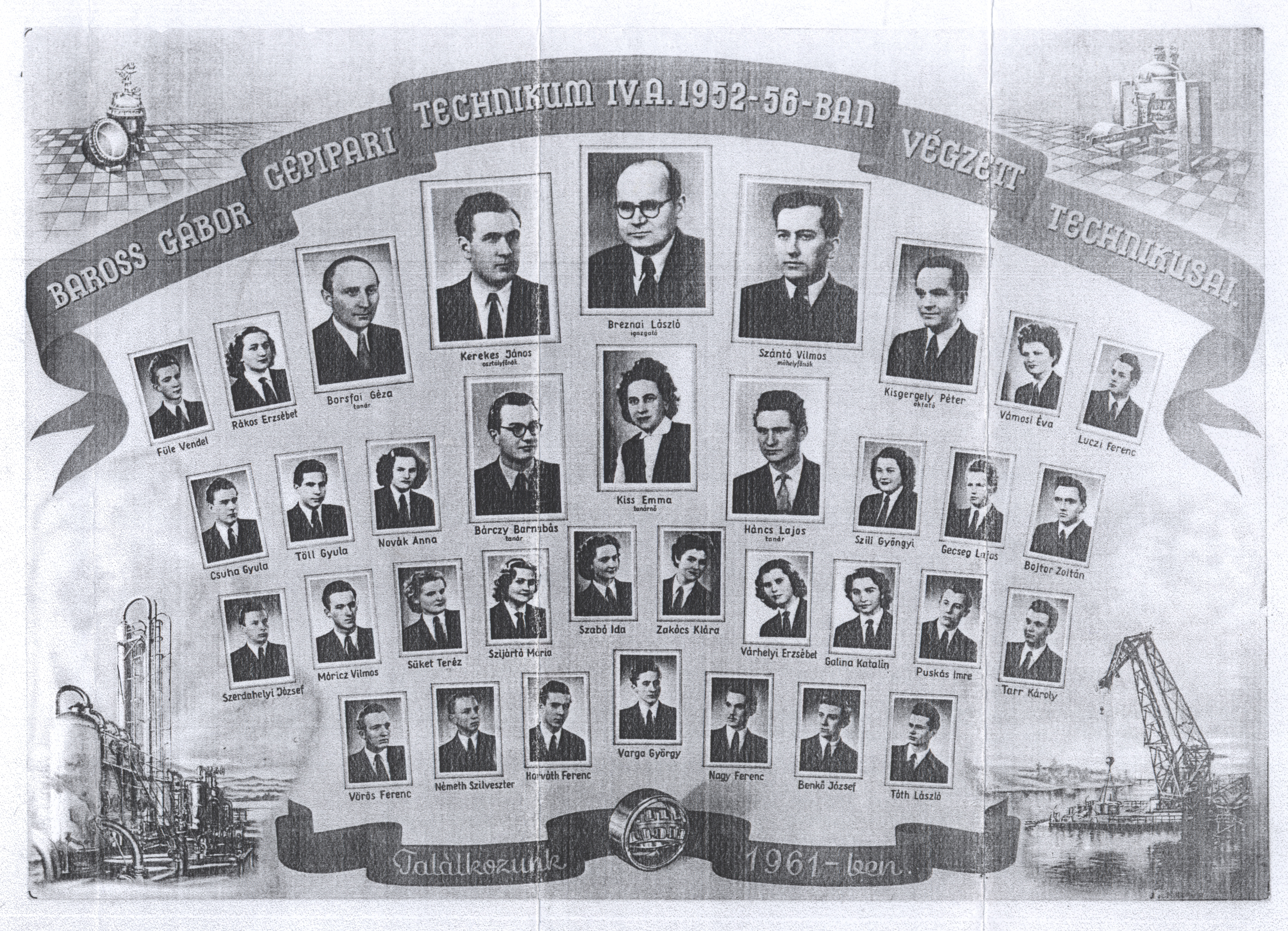 Nyilvános 1795 | 2917 | Baross Gábor Gépipari Technikum IV.A. 1952-56-ban végzett technikusai | Bárczy Barnabás tanár Borsfai Géza tanár Breznai László igazgató Háncs Lajos tanár Kerekes János osztályfőnök Kisgergely Péter oktató Kiss Emma tanárnő Szántó Vilmos műhelyfőnök Benkő József Bojtor Zoltán Csuha Gyula Füle Vendel Galina Katalin Gecseg Lajos Horváth Ferenc Luczi Ferenc Móricz Vilmos Nagy Ferenc Németh Szilveszter Novák Anna Puskás Imre Rákos Erzsébet Süket Teréz Szabó Ida Szerdahelyi József Szijártó Mária Szili Gyöngyi Tarr Károly Tóth László Töll Gyula Vámosi Éva Varga György Várhelyi Erzsébet Vörös Ferenc Zakócs Klára |
