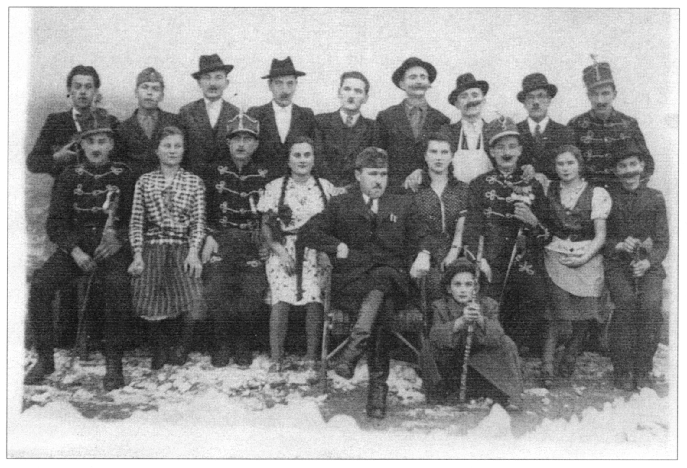 Nyilvános 2348 | 5844 | "A vén bakancsos... társulata" | Felső sor, balról: Horváth Rudolf, Révész István, Fleck József, Somogyi György, Pálmai László, Varga Lajos, Vajdai Károly, Dara József Alsó sor: Skoda Ferenc, Gyergyák Margit, Pusztai László, Gyergyák Anna, Vértes Imre, Vajdai Erzsébet, Somogyi Péter, Bedi Anna (Hajnalka), Sali László |