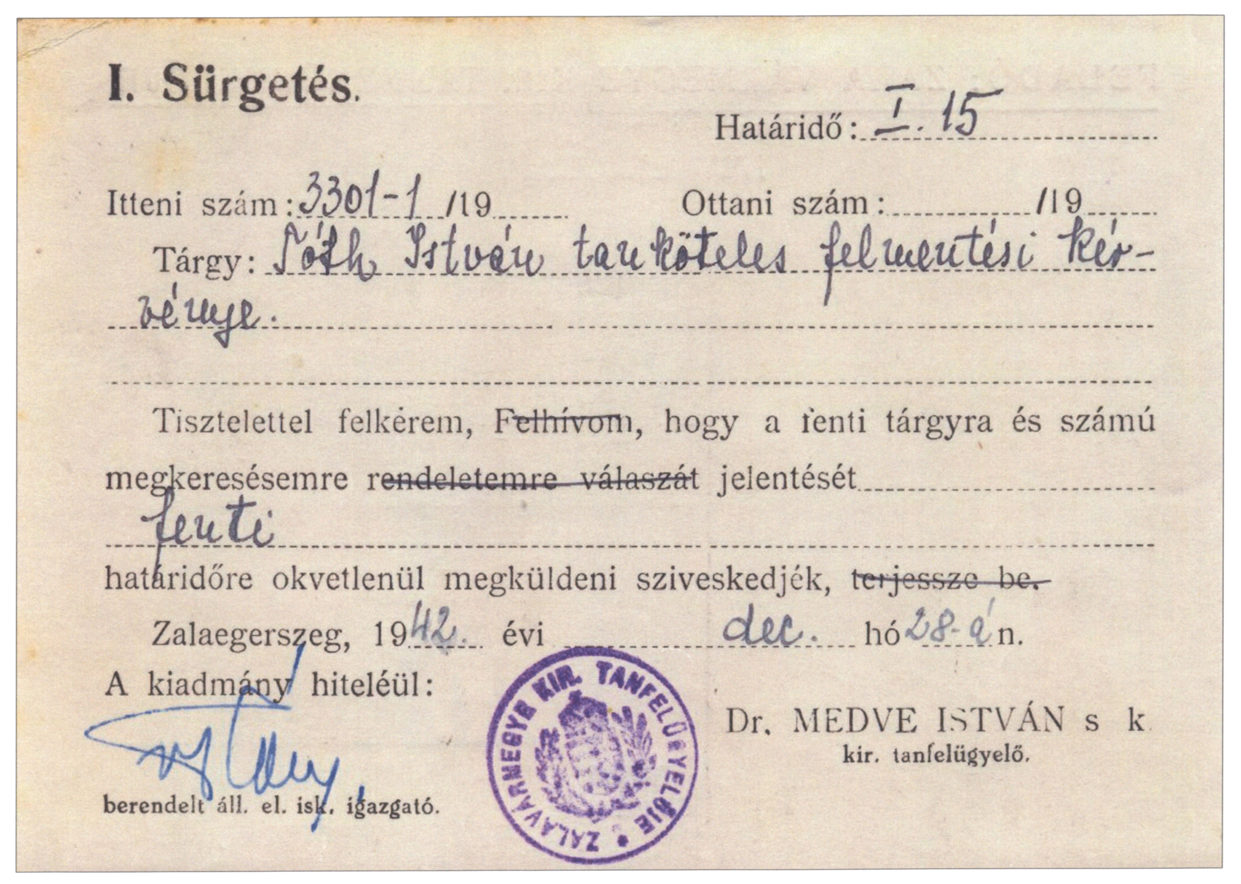 Nyilvános 2357 | 5573 | Rövid leírás | Teljes leírás (68 B) | Sürgetés. Tárgy: Tóth István tanköteles felmentési kérvénye |
