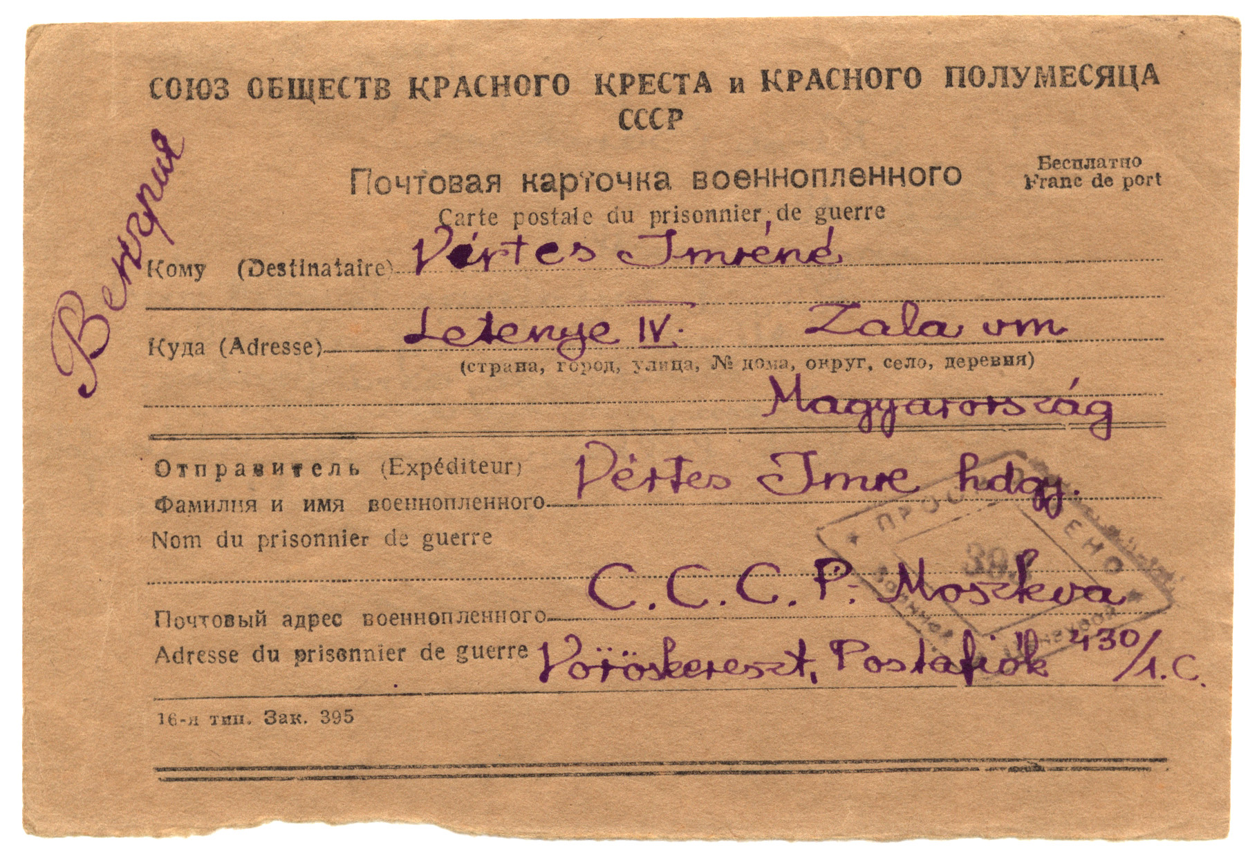 Nyilvános 1766 | 2783 | Vértes Imréné | Letenye IV. Zala vm. Magyarország Vértes Imre hdgy. C.C.C.P. Moszkva Vöröskereszt, Postafiók 430/1. c. 1946.X.20. Kicsi Sárikám! Élek, szeretlek, nagyon szeretlek. Rövid, tartalmas levelet várok. Mindenkiről írj, aki él. Mindenről, ami fontos. Egészségem, jó sorom van. Csak a lelkem szomjas utánatok. Viszontlátásra! Imre |
