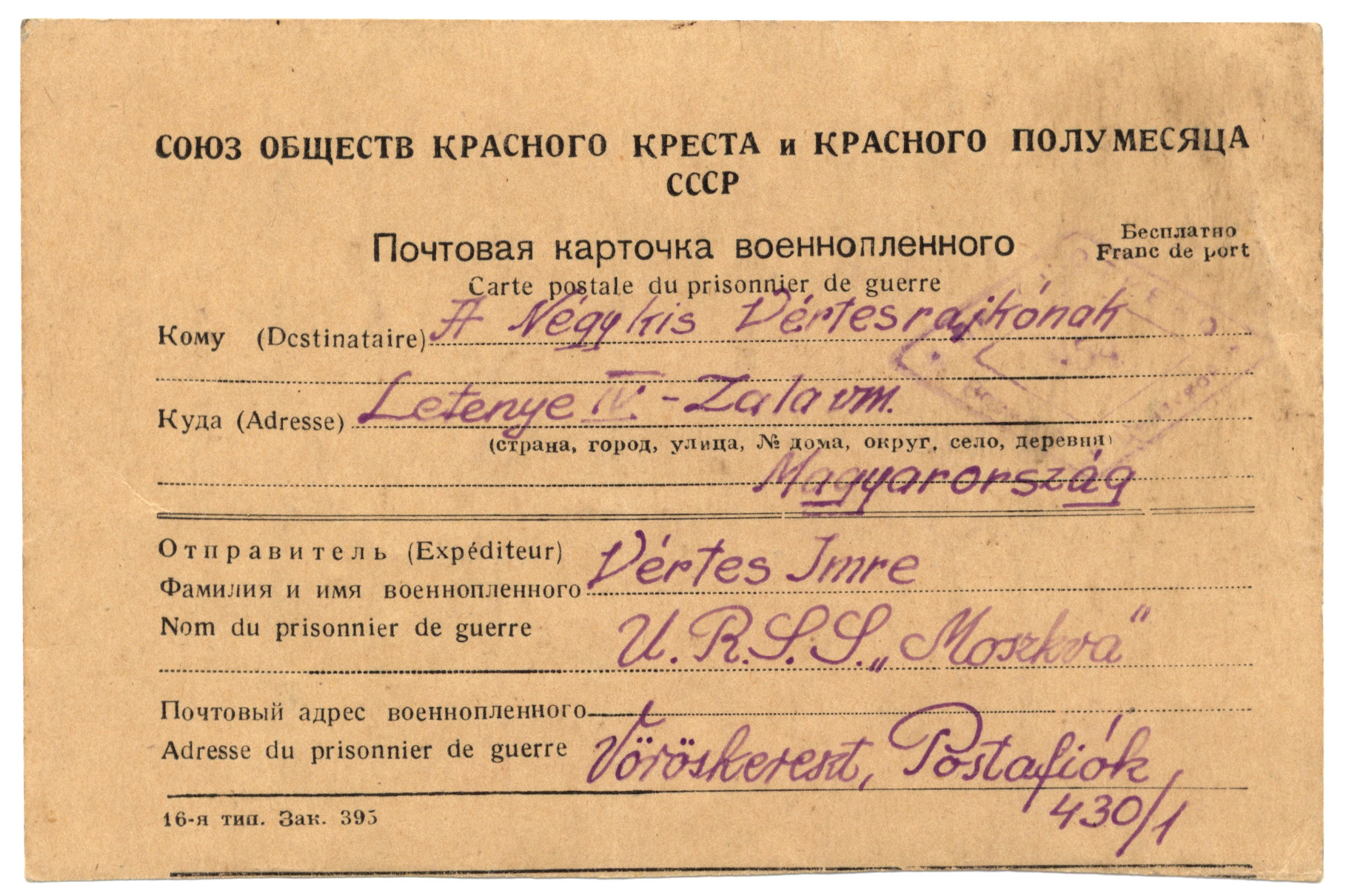 Nyilvános 1690 | 2644 | A Négy kis Vértesrajkónak | Letenye IV. - Zala vm. Magyarország Vértes Imre U.R.S.S. "Moszkva" Vöröskereszt, Postafiók 430/1. c. 1947. II. 10. Kicsiny fészek, benn négy fecske, Élő fészek élő kincse: Négy fióka; négy kis lélek Gellért, Jutka, bennem éltek, Eszter, Györgyi: Kicsi fecskék, Rátok szállnak álomlepkék Attól, akit hazavártok, Éj-nap, aki gondol Rátok. Messzeszakadt Apukátok |