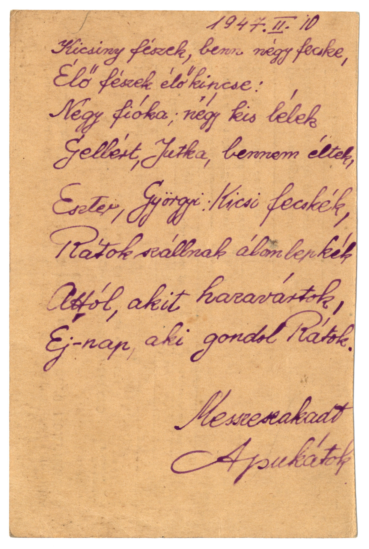 Nyilvános 1673 | 2593 | A Négy kis Vértesrajkónak | Letenye IV. - Zala vm. Magyarország Vértes Imre U.R.S.S. "Moszkva" Vöröskereszt, Postafiók 430/1. c. 1947. II. 10. Kicsiny fészek, benn négy fecske, Élő fészek élő kincse: Négy fióka; négy kis lélek Gellért, Jutka, bennem éltek, Eszter, Györgyi: Kicsi fecskék, Rátok szállnak álomlepkék Attól, akit hazavártok, Éj-nap, aki gondol Rátok. Messzeszakadt Apukátok |