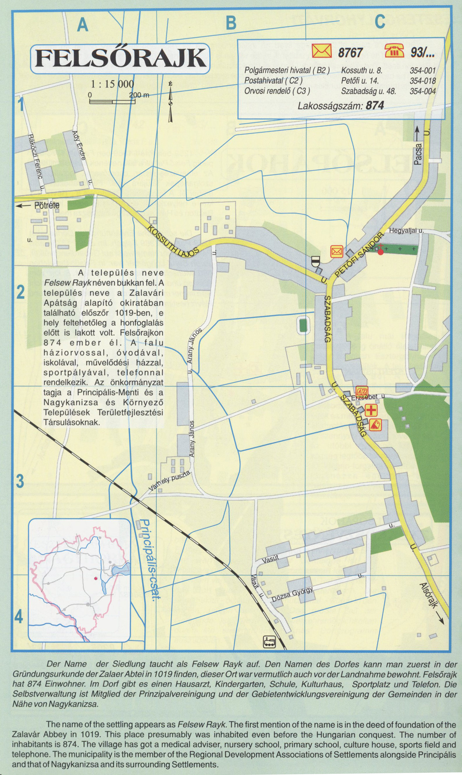 Nyilvános 2730 | 8527 | Rövid leírás | Teljes leírás (2.21 KB) | Felsőrajk A település neveFelsew Rayknéven bukkan fel. A település neve a Zalavári Apátság alapító okiratában található először 1019-ben, e hely feltehetőleg a honfoglalás előtt is lakott volt. Felsőrajkon 874 ember él. A falu háziorvossal, óvodával, iskolával, művelődési házzal, sportpályával, telefonnal.rendelkezik. Az önkormányzat tagja a Principális-Menti és a Nagykanizsa és Környező Települések Területfejlesztési Társulásoknak. Der Name der Siedlung taucht als Felsew Rayk auf. Den Namen des Dorfes kann man zuerst in der Gründungsurkunde der Zalaer Abtei in 1019 finden, dieser Ort war vermutlich auch vor der Landnahme bewohnt. Felsőrajk hat 874 Einwohner. Im Dorf gibt es einen Hausarzt, Kindergarten, Schule, Kulturhaus, Sportplatz und Telefon. Die Selbstverwaltung ist Mitglied der Prinzipalvereinigung und der Gebietentwicklungsvereinigung der Gemeinden in der Nähe von Nagykanizsa. The name of the settling appears as Felsew Rayk. The first mention of the name is in the deed of foundation of the Zalavár Abbey in 1019. This place presumably was inhabited even before the Hungarian conquest. The number of inhabitants is 874. The village has got a medical adviser, nursery school, primary school, culture house, sports field and telephone. The municipality is the member of the Regional Development Associations of Settlements alongside Principális and that of Nagykanizsa and its surrounding Settlements. A részlet a következő kiadványból származik/Die Teile stammen vom volgenden Buch/This text came from the following book: Cím/Titel/Title: Zala megye településeinek atlasza - 257 település részletes térképe/Atlas der Komitat Zala - 257 Detailte Siedlungskarten/Zala county\'s Atlas - 257 settlement maps. Közreműködő/contributor: Lackner László (1943) (fotó) Kiadás/Ausgabe/Publisher: Gyula : HISZI-MAP, 1997 Sorozat/Serie/Series: Indulástól - megérkezésig... ETO: 912(439.121-2) ; 908.439.121 Cutter: Z 19 ISBN: 963-610-025-4 Oldalszám/Seiten/Pages: 323, 81 p. Megjegyzés/Note: Lezárva/Abgeschlossen am/Closed am: 1997. máj. 30. |