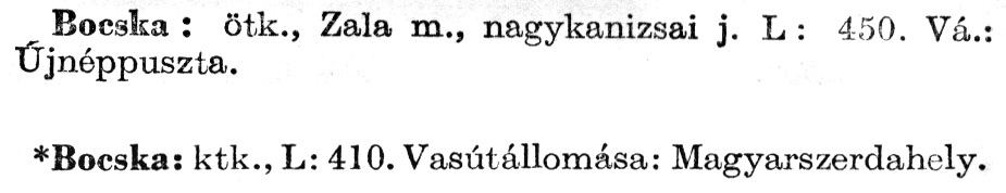 Nyilvános 2744 | 6483 | A szócikkek felismertetett szövege: | (A csillag után az 1972-es kiadású kiegészítő kötetből származó szöveg következik) Bocska: ötk., Zala m., nagykanizsai j. L : 450. Vá.: Újnéppuszta. *Bocska: ktk., L: 410. Vasútállomása: Magyarszerdahely. A szócikkek a következő lexikonból származnak: Cím: Új magyar lexikon Közreműködő: Berei Andor (1900-1979) (szerk.) Szerz. közl.: [szerk. Berei Andor et al.] Kiadás jelzés: 2. lny. Kiadás: Budapest : Akad. K., 1961-1962 Kötetei: 1., A - C 2., D - F 3., G - J 4., K - Me 5., Mf - R 6., S - Z 7. köt., A-Z Kiegészítő kötet (1972) Kiegészítő kötet, 1962÷1980 (1981) ETO jelzet: 03=945.11 Szakjelzet: 030 Cutter: U 28 Nyelv: magyar Megjegyzés: Bibliogr. a címszavak egy részének végén |