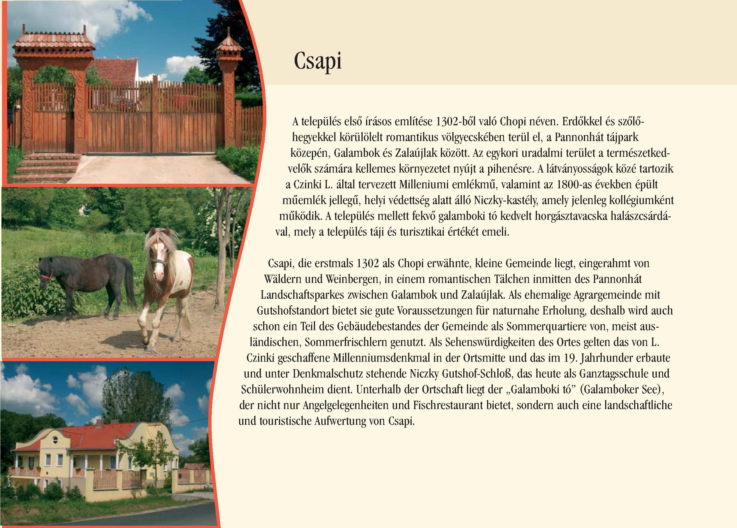 Nyilvános 2933 | 9576 | Csapi | Csapi, die erstmals 1302 als Chopi erwähnte, kleine Gemeinde liegt, eingerahmt von Wäldern und Weinbergen, in einem romantischen Tälchen inmitten des Pannonhát Landschaftsparkes zwischen Galambok und Zalaújlak. Als ehemalige Agrargemeinde mit Gutshofstandort bietet sie gute Voraussetzungen für naturnahe Erholung, deshalb wird auch schon ein Teil des Gebäudebestandes der Gemeinde als Sommerquartiere von, meist ausländischen, Sommerfrischlern genutzt. Als Sehenswürdigkeiten des Ortes gelten das von L. Czinki geschaffene Millenniumsdenkmal in der Ortsmitte und das im 19. Jahrhunder erbaute und unter Denkmalschutz stehende Niczky Gutshof-Schloß, das heute als Ganztagsschule und Schülerwohnheim dient. Unterhalb der Ortschaft liegt der ,,Galamboki tó" (Galamboker See), der nicht nur Angelgelegenheiten und Fischrestaurant bietet, sondern auch eine landschaftliche und touristische Aufwertung von Csapi. Dieses Text stammt von: Pannonhát tájpark prospektus 2006. Web: http://www.pannonhat.hu/ (auch in Deutsch) |