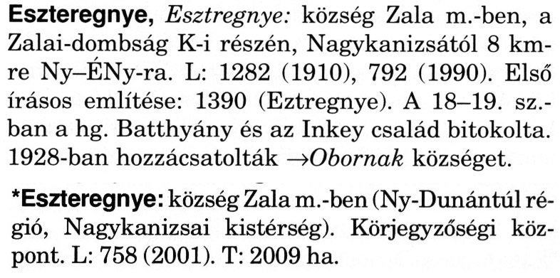 Nyilvános 2721 | 6819 | A szócikkek felismertetett szövege: | (A csillag után a kiegészítő kötetből származó szöveg következik) Eszteregnye, Esztregnye: község Zala m.-ben, a Zalai-dombság K-i részén, Nagykanizsától 8 km-re Ny-ÉNy-ra. L: 1282 (1910), 792 (1990). Első írásos említése: 1390 (Eztregnye). A 18–19. sz.-ban a hg. Batthyány és az Inkey család bitokolta. 1928-ban hozzácsatolták → Obornak községet. *Eszteregnye: község Zala m.-ben (Ny-Dunántúl régió, Nagykanizsai kistérség). Körjegyzőségi központ. L: 758 (2001). T: 2009 ha. A szócikkek a következő lexikonból származnak: Cím: Magyar nagylexikon Közreműködő: Élesztős László (1949) (szerk.) ; Barabás Éva (1943) (szerk.) ; Berényi Gábor (1946) (szerk.) ; Bárány Lászlóné (szerk.) ; Adelmann-né Kertész Judit (1945) (közrem.) ; Froemel Károlyné Jáky Éva (1936) (közrem.) ; Akadémiai Kiadó és Nyomda Vállala Szerz. közl.: [... Élesztős László főszerk.] ; [szerk. Barabás Éva et al.] ; [bibliogr. Adelmanné Kertész Judit] ; [kész. az Akadémiai Kiadó Magyar Nagylexikon Szerkesztőségében] Kiadás: Budapest : Akad. K., 1993- Kötetei: 1. köt., A - Anc 2. köt., And - Bag 3. köt., Bah - Bij 4. köt., Bik - Bz 5. köt., C - Csem 6. köt., Csen - Ec 7. köt., Ed - Fe 8. köt., Ff - Gyep 9. köt., Gyer - Iq 10. köt., Ir - Kip 11. köt., Kir - Lem 12. köt., Len - Mep 13. köt., Mer - Nyk 14. köt., Nyl - Pom 15. köt., Pon - Sek 16. köt., Sel - Szö 17. köt., Szp - Ung 18. köt., Unh - Z 19. köt., Kiegészítő kötet, A - Z ETO jelzet: 030=945.11 Szakjelzet: 030 Cutter: M 14 ISBN: 963-05-6611-7 [!ISBN 963-05-6615-X] Nyelv: magyar Megjegyzés: Az 5. kötettől kiad. a Magyar Nagylexikon Kiadó ; A 6. kötettől főszerk. Berényi Gábor ; A 6. kötettől szakszerk. Bárány Lászlóné et al. ; A 6. kötettől bibliogr. Froemel Károlyné ; Bibliogr. a szócikkek végén |
