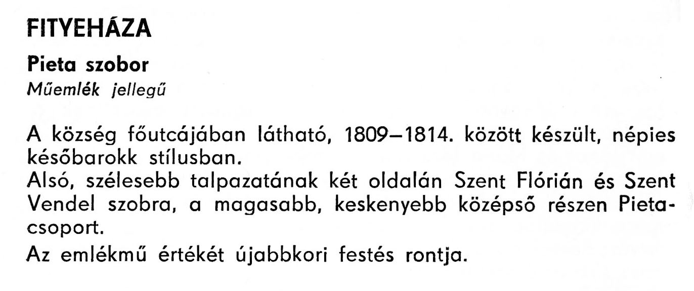 Nyilvános 2625 | 6969 | Fityeháza - Zala megye műemlékei 1977 056old | A részlet szövege: FITYEHÁZA Pieta szobor Műemlék jellegű A község főutcájában látható, 1809-1814. között készült, népies későbarokk stílusban. Alsó, szélesebb talpazatának két oldalán Szent Flórián és Szent Vendel szobra, a magasabb, keskenyebb középső részen Pieta-csoport. Az emlékmű értékét újabbkori festés rontja. A részlet a következő könyvből származik: Cím: Zala megye műemlékei Szerző: Németh József (1928) Közreműködő: Lantos Miklós (fotó) Szerz. közl.: Németh József ; [fotók... Lantos Miklós] Kiadás: Zalaegerszeg : Zalai Ny., 1977 ETO jelzet: 72(439.121) ; 7.025.3/.4 ; 908.439.121 Tárgyszó: Zala megye Szakjelzet: 908 Cutter: N 53 Nyelv: magyar Oldalszám: 109 p. |