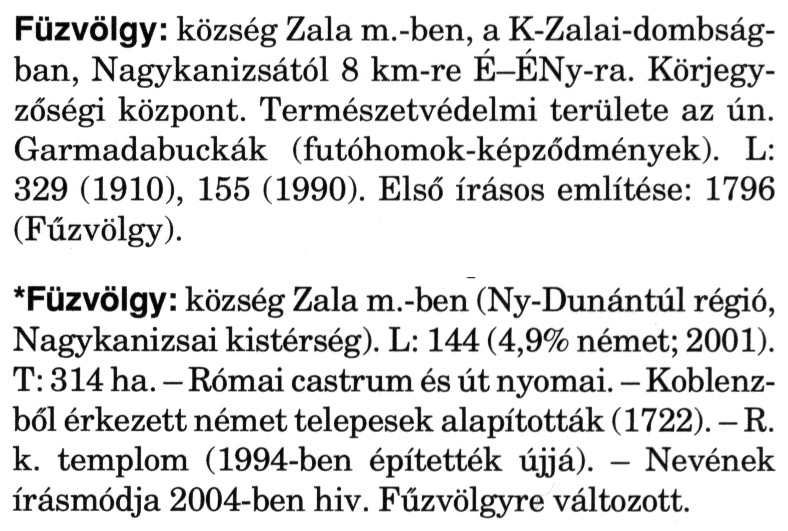 Nyilvános 2726 | 6808 | A szócikkek felismertetett szövege: | (A csillag után a kiegészítő kötetből származó szöveg következik) Füzvölgy: község Zala m.-ben, a K-Zalai-dombság-ban, Nagykanizsától 8 km-re É-ÉNy-ra. Körjegyzőségi központ. Természetvédelmi területe az ún. Garmadabuckák (futóhomok-képződmények). L: 329 (1910), 155 (1990). Első írásos említése: 1796 (Fűzvölgy). *Füzvölgy: község Zala m.-ben (Ny-Dunántúl régió, Nagykanizsai kistérség). L: 144 (4,9% német; 2001). T: 314 ha. - Római castrum és út nyomai. - Koblenz-ből érkezett német telepesek alapították (1722). - R. k. templom (1994-ben építették újjá). - Nevének írásmódja 2004-ben hiv. Fűzvölgyre változott. A szócikkek a következő lexikonból származnak: Cím: Magyar nagylexikon Közreműködő: Élesztős László (1949) (szerk.) ; Barabás Éva (1943) (szerk.) ; Berényi Gábor (1946) (szerk.) ; Bárány Lászlóné (szerk.) ; Adelmann-né Kertész Judit (1945) (közrem.) ; Froemel Károlyné Jáky Éva (1936) (közrem.) ; Akadémiai Kiadó és Nyomda Vállala Szerz. közl.: [... Élesztős László főszerk.] ; [szerk. Barabás Éva et al.] ; [bibliogr. Adelmanné Kertész Judit] ; [kész. az Akadémiai Kiadó Magyar Nagylexikon Szerkesztőségében] Kiadás: Budapest : Akad. K., 1993- Kötetei: 1. köt., A - Anc 2. köt., And - Bag 3. köt., Bah - Bij 4. köt., Bik - Bz 5. köt., C - Csem 6. köt., Csen - Ec 7. köt., Ed - Fe 8. köt., Ff - Gyep 9. köt., Gyer - Iq 10. köt., Ir - Kip 11. köt., Kir - Lem 12. köt., Len - Mep 13. köt., Mer - Nyk 14. köt., Nyl - Pom 15. köt., Pon - Sek 16. köt., Sel - Szö 17. köt., Szp - Ung 18. köt., Unh - Z 19. köt., Kiegészítő kötet, A - Z ETO jelzet: 030=945.11 Szakjelzet: 030 Cutter: M 14 ISBN: 963-05-6611-7 [!ISBN 963-05-6615-X] Nyelv: magyar Megjegyzés: Az 5. kötettől kiad. a Magyar Nagylexikon Kiadó ; A 6. kötettől főszerk. Berényi Gábor ; A 6. kötettől szakszerk. Bárány Lászlóné et al. ; A 6. kötettől bibliogr. Froemel Károlyné ; Bibliogr. a szócikkek végén |