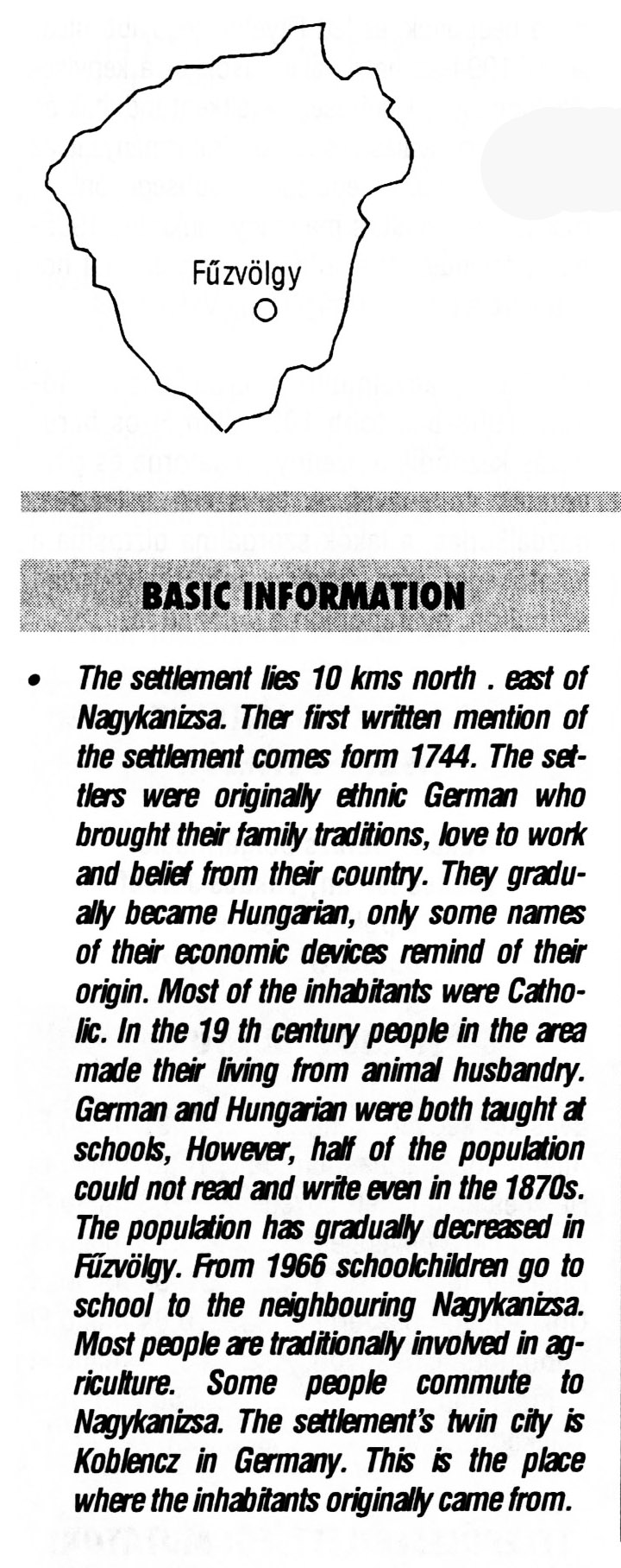Nyilvános 2793 | 7171 | Fűzvölgy | BASIC INFORMATION The settlement lies 10 kms northeast of Nagykanizsa. The first written mention of the settlement comes form 1744. The settlers were originally ethnic German who brought ther family traditions, love to work and belief from ther country. They gradually became Hungarian, only some names of their economic devices remind of their origin. Most of the inhabitants were Catholic. In the 19 th century people in the area made their living from animal husbandry. German and Hungarian were both taught at schools, However, half of the population could not read and write even in the 1870s. The population has gradually decreased in Fűzvölgy. From 1966 schoolchildren go to school to the neighbouring Nagykanizsa. Most people are traditionally involved in agriculture. Some people commute to Nagykanizsa. The settlement\'s twin city is Koblencz in Germany. This is the place where the inhabitants originally came from. This text came from the following book: Title: Handbook of Zala county (Zala megye kézikönyve) Series: County handbooks of Hungary (Magyarország megyei kézikönyvei) Chief editor: Hóbor József Publisher: (Hatvan), CEBA-Hungary Ltd, 1998 ETO: 908.439.121(035) ; 050.8(439.121) ISBN: 963-9089-18-2 Pages: 488-1040 p. Remark: Closed on: 1998. márc. 31. |