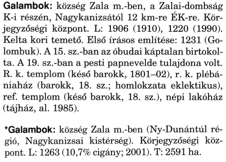 Nyilvános 2567 | 5069 | A szócikkek felismertetett szövege: | (A csillag után a kiegészítő kötetből származó szöveg következik) Galambok: község Zala m.-ben, a Zalai-dombság K-i részén, Nagykanizsától 12 km-re ÉK-re. Körjegyzőségi központ. L: 1906 (1910), 1220 (1990). Kelta kori temető. Első írásos említése: 1231 (Go-lombuk). A 15. sz.-ban az óbudai káptalan birtokolta. A 19. sz.-ban a pesti papnevelde tulajdona volt. R. k. templom (késő barokk, 1801-02), r. k. plébániaház (barokk, 18. sz.; homlokzata eklektikus), ref. templom (késő barokk, 18. sz.), népi lakóház (tájház, al. 1985). *Galambok: község Zala m.-ben (Ny-Dunántúl régió, Nagykanizsai kistérség). Körjegyzőségi központ. L: 1263 (10,7% cigány; 2001). T: 2591 ha. A szócikkek a következő lexikonból származnak: Cím: Magyar nagylexikon Közreműködő: Élesztős László (1949) (szerk.) ; Barabás Éva (1943) (szerk.) ; Berényi Gábor (1946) (szerk.) ; Bárány Lászlóné (szerk.) ; Adelmann-né Kertész Judit (1945) (közrem.) ; Froemel Károlyné Jáky Éva (1936) (közrem.) ; Akadémiai Kiadó és Nyomda Vállala Szerz. közl.: [... Élesztős László főszerk.] ; [szerk. Barabás Éva et al.] ; [bibliogr. Adelmanné Kertész Judit] ; [kész. az Akadémiai Kiadó Magyar Nagylexikon Szerkesztőségében] Kiadás: Budapest : Akad. K., 1993- Kötetei: 1. köt., A - Anc 2. köt., And - Bag 3. köt., Bah - Bij 4. köt., Bik - Bz 5. köt., C - Csem 6. köt., Csen - Ec 7. köt., Ed - Fe 8. köt., Ff - Gyep 9. köt., Gyer - Iq 10. köt., Ir - Kip 11. köt., Kir - Lem 12. köt., Len - Mep 13. köt., Mer - Nyk 14. köt., Nyl - Pom 15. köt., Pon - Sek 16. köt., Sel - Szö 17. köt., Szp - Ung 18. köt., Unh - Z 19. köt., Kiegészítő kötet, A - Z ETO jelzet: 030=945.11 Szakjelzet: 030 Cutter: M 14 ISBN: 963-05-6611-7 [!ISBN 963-05-6615-X] Nyelv: magyar Megjegyzés: Az 5. kötettől kiad. a Magyar Nagylexikon Kiadó ; A 6. kötettől főszerk. Berényi Gábor ; A 6. kötettől szakszerk. Bárány Lászlóné et al. ; A 6. kötettől bibliogr. Froemel Károlyné ; Bibliogr. a szócikkek végén |