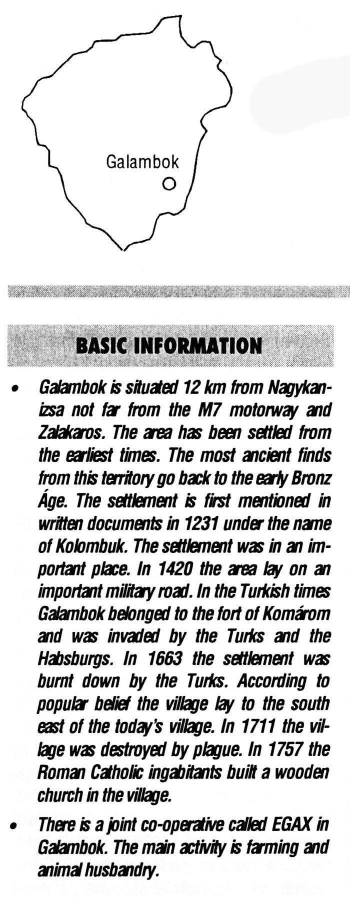 Nyilvános 2826 | 7573 | Galambok | BASIC INFORMATION Galambok is situated 12 km from Nagykanizsa not far from the M7 motorway and Zalakaros. The area has been settled from the earliest times. The most ancient finds from this territory go back to the early Bronz Age. The settlement is first mentioned in written documents in 1231 under the name of Kolombuk. The settlement was in an important place. In 1420 the area lay on an important military road. In the Turkish times Galambok belonged to the fort of Komárom and was invaded by the Turks and the Habsburgs. In 1663 the settlement was burnt down by the Turks. According to popular belief the village lay to the south east of the today\'s village. In 1711 the village was destroyed by plague. In 1757 the Roman Catholic ingabitants built a wooden church in the village. There is a joint co-operative called EGAX in Galambok. The main activity is farming and animal husbandry. This text came from the following book: Title: Handbook of Zala county (Zala megye kézikönyve) Series: County handbooks of Hungary (Magyarország megyei kézikönyvei) Chief editor: Hóbor József Publisher: (Hatvan), CEBA-Hungary Ltd, 1998 ETO: 908.439.121(035) ; 050.8(439.121) ISBN: 963-9089-18-2 Pages: 488-1040 p. Remark: Closed on: 1998. márc. 31. |