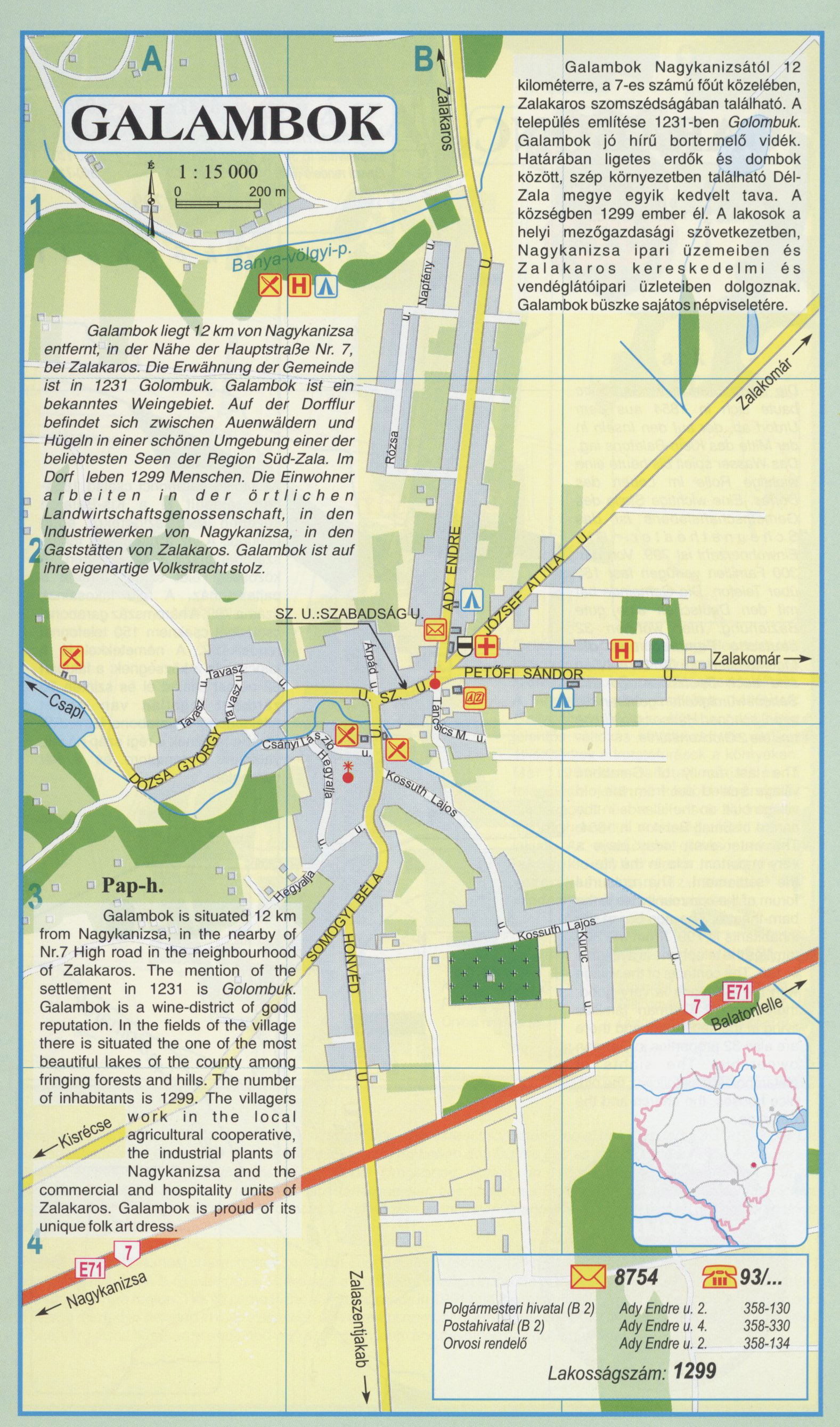 Nyilvános 2851 | 8470 | Galambok | Galambok Nagykanizsától 12 kilométerre, a 7-es számú főút közelében, Zalakaros szomszédságában található. A település említése 1231-ben Golombuk. Galambok jó hírű bortermelő vidék. Határában ligetes erdők és dombok között, szép környezetben található Dél-Zala megye egyik kedvelt tava. A községben 1299 ember él. A lakosok a helyi mezőgazdasági szövetkezetben, Nagykanizsa ipari üzemeiben és Zalakaros kereskedelmi és vendéglátóipari üzleteiben dolgoznak. Galambok büszke sajátos népviseletére. Galambok liegt 12 km von Nagykanizsa entlernt, in der Nähe der Hauptstraße Nr. 7, bei Zalakaros. Die Erwähnung der Gemeinde ist in 1231 Golombuk. Galambok ist ein bekanntes Weingebiet. Auf der Dorfflur befindet sich zwischen Auenwäldern und Hügeln in einer schönen Umgebung einer der beliebtesten Seen der Region Süd-Zala. Im Dorf leben 1299 Menschen. Die Einwohner arbeiten in der örtlichen Landwirtschaftsgenossenschaft, in den Industriewerken von Nagykanizsa, in den Gaststätten von Zalakaros. Galambok ist auf ihre eigenartige Volkstracht stolz. Galambok is situated 12 km from Nagykanizsa, in the nearby of Nr.7 High road in the neighbourhood of Zalakaros. The mention of the settlement in 1231 is Golombuk. Galambok is a wine-district of good reputation. In the fields of the village there is situated the one of the most beautiful lakes of the county among fringing forests and hills. The number of inhabitants is 1299. The villagers work in the local agricultural cooperative, the industrial plants of Nagykanizsa and the commercial and hospitality units of Zalakaros. Galambok is proud of its unique folk art dress. A részlet a következő kiadványból származik/Die Teile stammen vom volgenden Buch/This text came from the following book: Cím/Titel/Title: Zala megye településeinek atlasza - 257 település részletes térképe/Atlas der Komitat Zala - 257 Detailte Siedlungskarten/Zala county\'s Atlas - 257 settlement maps. Közreműködő/contributor: Lackner László (1943) (fotó) Kiadás/Ausgabe/Publisher: Gyula : HISZI-MAP, 1997 Sorozat/Serie/Series: Indulástól - megérkezésig... ETO: 912(439.121-2) ; 908.439.121 Cutter: Z 19 ISBN: 963-610-025-4 Oldalszám/Seiten/Pages: 323, 81 p. Megjegyzés/Note: Lezárva/Abgeschlossen am/Closed am: 1997. máj. 30. |