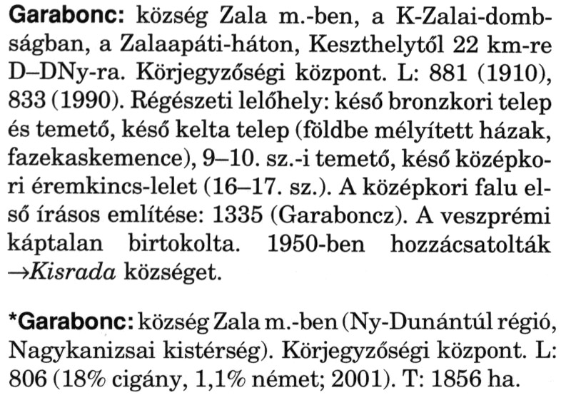 Nyilvános 2845 | 6973 | A szócikkek felismertetett szövege: | (A csillag után a kiegészítő kötetből származó szöveg következik) Garabonc: község Zala m.-ben, a K-Zalai-domb-ságban, a Zalaapáti-háton, Keszthelytől 22 km-re D-DNy-ra. Körjegyzőségi központ. L: 881 (1910), 833 (1990). Régészeti lelőhely: késő bronzkori telep és temető, késő kelta telep (földbe mélyített házak, fazekaskemence), 9-10. sz.-i temető, késő középkori éremkincs-lelet (16-17. sz.). A középkori falu első írásos említése: 1335 (Garaboncz). A veszprémi káptalan birtokolta. 1950-ben hozzácsatolták →Kisrada községet. *Garabonc: község Zala m.-ben (Ny-Dunántúl régió, Nagykanizsai kistérség). Körjegyzőségi központ. L: 806 (18% cigány, 1,1% német; 2001). T: 1856 ha. A szócikkek a következő lexikonból származnak: Cím: Magyar nagylexikon Közreműködő: Élesztős László (1949) (szerk.) ; Barabás Éva (1943) (szerk.) ; Berényi Gábor (1946) (szerk.) ; Bárány Lászlóné (szerk.) ; Adelmann-né Kertész Judit (1945) (közrem.) ; Froemel Károlyné Jáky Éva (1936) (közrem.) ; Akadémiai Kiadó és Nyomda Vállala Szerz. közl.: [... Élesztős László főszerk.] ; [szerk. Barabás Éva et al.] ; [bibliogr. Adelmanné Kertész Judit] ; [kész. az Akadémiai Kiadó Magyar Nagylexikon Szerkesztőségében] Kiadás: Budapest : Akad. K., 1993- Kötetei: 1. köt., A - Anc 2. köt., And - Bag 3. köt., Bah - Bij 4. köt., Bik - Bz 5. köt., C - Csem 6. köt., Csen - Ec 7. köt., Ed - Fe 8. köt., Ff - Gyep 9. köt., Gyer - Iq 10. köt., Ir - Kip 11. köt., Kir - Lem 12. köt., Len - Mep 13. köt., Mer - Nyk 14. köt., Nyl - Pom 15. köt., Pon - Sek 16. köt., Sel - Szö 17. köt., Szp - Ung 18. köt., Unh - Z 19. köt., Kiegészítő kötet, A - Z ETO jelzet: 030=945.11 Szakjelzet: 030 Cutter: M 14 ISBN: 963-05-6611-7 [!ISBN 963-05-6615-X] Nyelv: magyar Megjegyzés: Az 5. kötettől kiad. a Magyar Nagylexikon Kiadó ; A 6. kötettől főszerk. Berényi Gábor ; A 6. kötettől szakszerk. Bárány Lászlóné et al. ; A 6. kötettől bibliogr. Froemel Károlyné ; Bibliogr. a szócikkek végén |