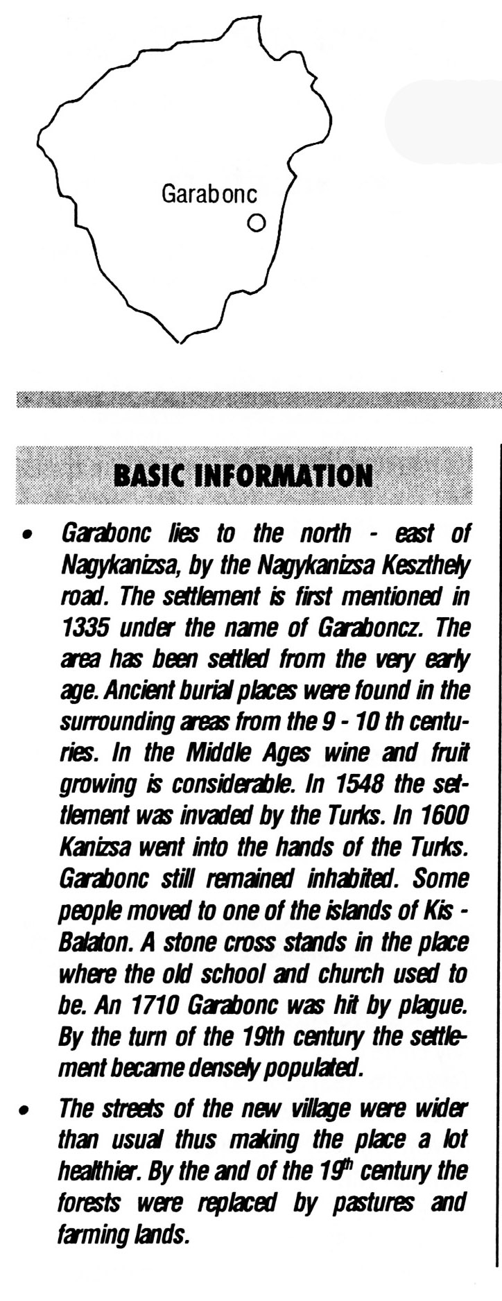 Nyilvános 2855 | 7433 | Rövid leírás | Teljes leírás (1.38 KB) | Garabonc BASIC INFORMATION Garabonc lies to the north-east of Nagykanizsa, by the Nagykanizsa Keszthely road. The settlement is first mentioned in 1335 under the name of Garaboncz. The area has been settled from the very early age. Ancient burial places were found in the surrounding areas from the 9 -10 th centu¬ries. In the Middle Ages wine and fruit growing is considerable. In 1548 the set¬tlement was invaded by the Turks. In 1600 Kanizsa went into the hands of the Turks. Garabonc still remained inhabited. Some people moved to one of the islands of Kis -Balaton. A stone cross stands in the place where the old school and church used to be. An 1710 Garabonc was hit by plague. By the turn of the 19th century the settle¬ment became densely populated. The streets of the new village were wider than usual thus making the place a lot healthier. By the and of the 19th century the forests were replaced by pastures and farming lands. This text came from the following book: Title: Handbook of Zala county (Zala megye kézikönyve) Series: County handbooks of Hungary (Magyarország megyei kézikönyvei) Chief editor: Hóbor József Publisher: (Hatvan), CEBA-Hungary Ltd, 1998 ETO: 908.439.121(035) ; 050.8(439.121) ISBN: 963-9089-18-2 Pages: 488-1040 p. Remark: Closed on: 1998. márc. 31. |