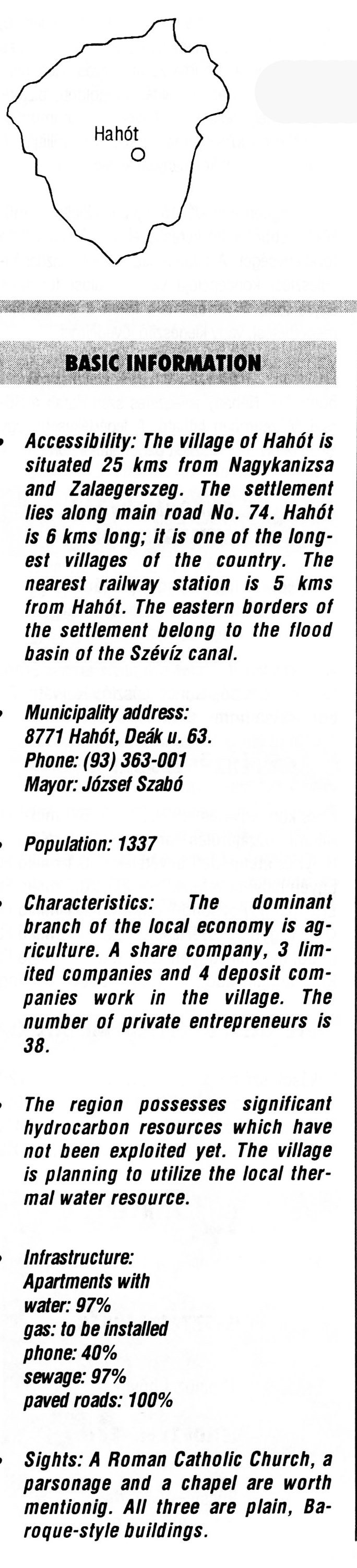 Nyilvános 2887 | 7346 | Hahót | BASIC INFORMATION Accessibility: The village of Hahót is situated 25 kms from Nagykanizsa and Zalaegerszeg. The settlement lies along main road No. 74. Hahót is 6 kms long; it is one of the longest villages of the country. The nearest railway station is 5 kms from Hahót. The eastern borders of the settlement belong to the flood basin of the Szévíz canal. Municipality address: 8771 Hahót, Deák u. 63. Phone: (93) 363-001 Mayor: József Szabó Population: 1337 Characteristics: The dominant branch of the local economy is agriculture. A share company, 3 limited companies and 4 deposit companies work in the village. The number of private entrepreneurs is 38. The region possesses significant hydrocarbon resources which have not been exploited yet. The village is planning to utilize the local thermal water resource. Infrastructure: Apartments with water: 97% gas: to be installed phone: 40% sewage: 97% paved roads: 100% Sights: A Roman Catholic Church, a parsonage and a chapel are worth mentionig. All three are plain, Baroque-style buildings. This text came from the following book: Title: Handbook of Zala county (Zala megye kézikönyve) Series: County handbooks of Hungary (Magyarország megyei kézikönyvei) Chief editor: Hóbor József Publisher: (Hatvan), CEBA-Hungary Ltd, 1998 ETO: 908.439.121(035) ; 050.8(439.121) ISBN: 963-9089-18-2 Pages: 488-1040 p. Remark: Closed on: 1998. márc. 31. |