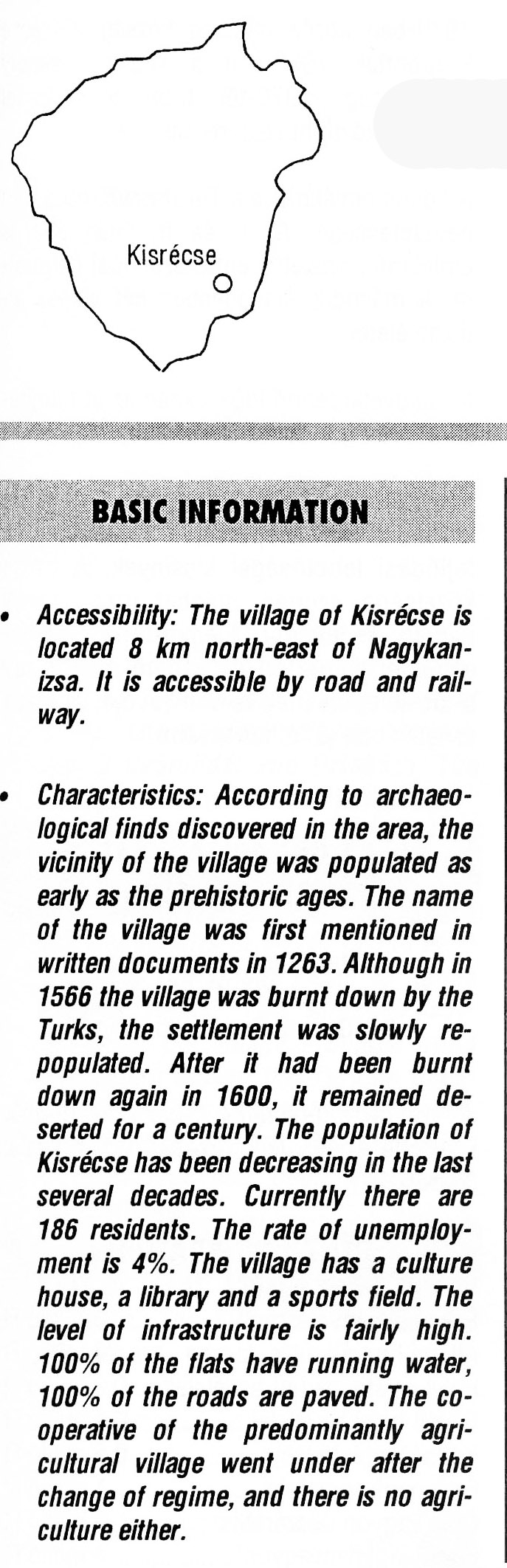 Nyilvános 2617 | 6739 | Kisrécse | BASIC INFORMATION Accessibility: The village of Kisrécse is located 8 km north-east of Nagykanizsa. It is accessible by road and railway. Characteristics: According to archaeological finds discovered in the area, the vicinity of the village was populated as early as the prehistoric ages. The name of the village was first mentioned in written documents in 1263. Although in 1566 the village was burnt down by the Turks, the settlement was slowly re-populated. After it had been burnt down again in 1600, it remained deserted for a century. The population of Kisrécse has been decreasing in the last several decades. Currently there are 186 residents. The rate of unemployment is 4%. The village has a culture house, a library and a sports field. The level of infrastructure is fairly high. 100% of the flats have running water, 100% of the roads are paved. The cooperative of the predominantly agricultural village went under after the change of regime, and there is no agriculture either. This text came from the following book: Title: Handbook of Zala county (Zala megye kézikönyve) Series: County handbooks of Hungary (Magyarország megyei kézikönyvei) Chief editor: Hóbor József Publisher: (Hatvan), CEBA-Hungary Ltd, 1998 ETO: 908.439.121(035) ; 050.8(439.121) ISBN: 963-9089-18-2 Pages: 488-1040 p. Remark: Closed on: 1998. márc. 31. |