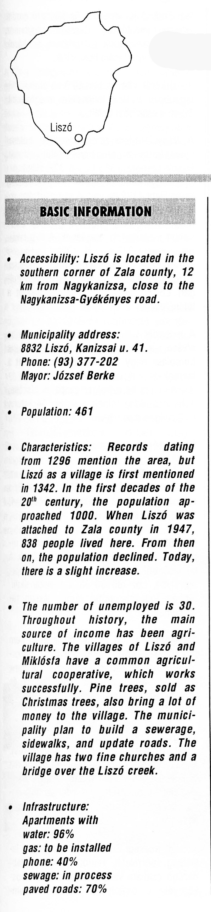 Nyilvános 2891 | 7466 | Rövid leírás | Teljes leírás (1.67 KB) | Liszó BASIC INFORMATION Accessibility: Liszó is located in the southern corner of Zala county, 12 km from Nagykanizsa, close to the Nagykanizsa-Gyékényes road. Municipality address: 8832 Liszó, Kanizsai u. 41. Phone: (93) 377-202 Mayor: József Berke Population: 461 Characteristics: Records dating from 1296 mention the area, but Liszó as a village is first mentioned in 1342. In the first decades of the 20th century, the population approached 1000. When Liszó was attached to Zala county in 1947, 838 people lived here. From then on, the population declined. Today, there is a slight increase. The number of unemployed is 30. Throughout history, the main source of income has been agriculture. The villages of Liszó and Miklósfa have a common agricultural cooperative, which works successfully. Pine trees, sold as Christmas trees, also bring a lot of money to the village. The municipality plan to build a sewerage, sidewalks, and update roads. The village has two fine churches and a bridge over the Liszó creek. Infrastructure: Apartments with water: 96% gas: to be installed phone: 40% sewage: in process paved roads: 70% This text came from the following book: Title: Handbook of Zala county (Zala megye kézikönyve) Series: County handbooks of Hungary (Magyarország megyei kézikönyvei) Chief editor: Hóbor József Publisher: (Hatvan), CEBA-Hungary Ltd, 1998 ETO: 908.439.121(035) ; 050.8(439.121) ISBN: 963-9089-18-2 Pages: 488-1040 p. Remark: Closed on: 1998. márc. 31. |