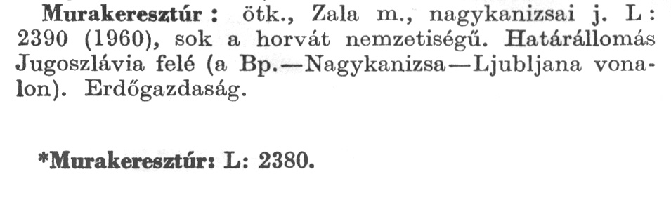 Nyilvános 2362 | 5991 | A szócikkek felismertetett szövege: | (A csillag után az 1972-es kiadású kiegészítő kötetből származó szöveg következik) Murakeresztúr: ötk., Zala m., nagykanizsai j. L: 2390 (1960), sok a horvát nemzetiségű. Határállomás Jugoszlávia felé (a Bp.–Nagykanizsa–Ljubljana vonalon). Erdőgazdaság. *Murakeresztúr: L: 2380. A szócikkek a következő lexikonból származnak: Cím: Új magyar lexikon Közreműködő: Berei Andor (1900-1979) (szerk.) Szerz. közl.: [szerk. Berei Andor et al.] Kiadás jelzés: 2. lny. Kiadás: Budapest : Akad. K., 1961-1962 Kötetei: 1., A - C 2., D - F 3., G - J 4., K - Me 5., Mf - R 6., S - Z 7. köt., A-Z Kiegészítő kötet (1972) Kiegészítő kötet, 1962÷1980 (1981) ETO jelzet: 03=945.11 Szakjelzet: 030 Cutter: U 28 Nyelv: magyar Megjegyzés: Bibliogr. a címszavak egy részének végén |