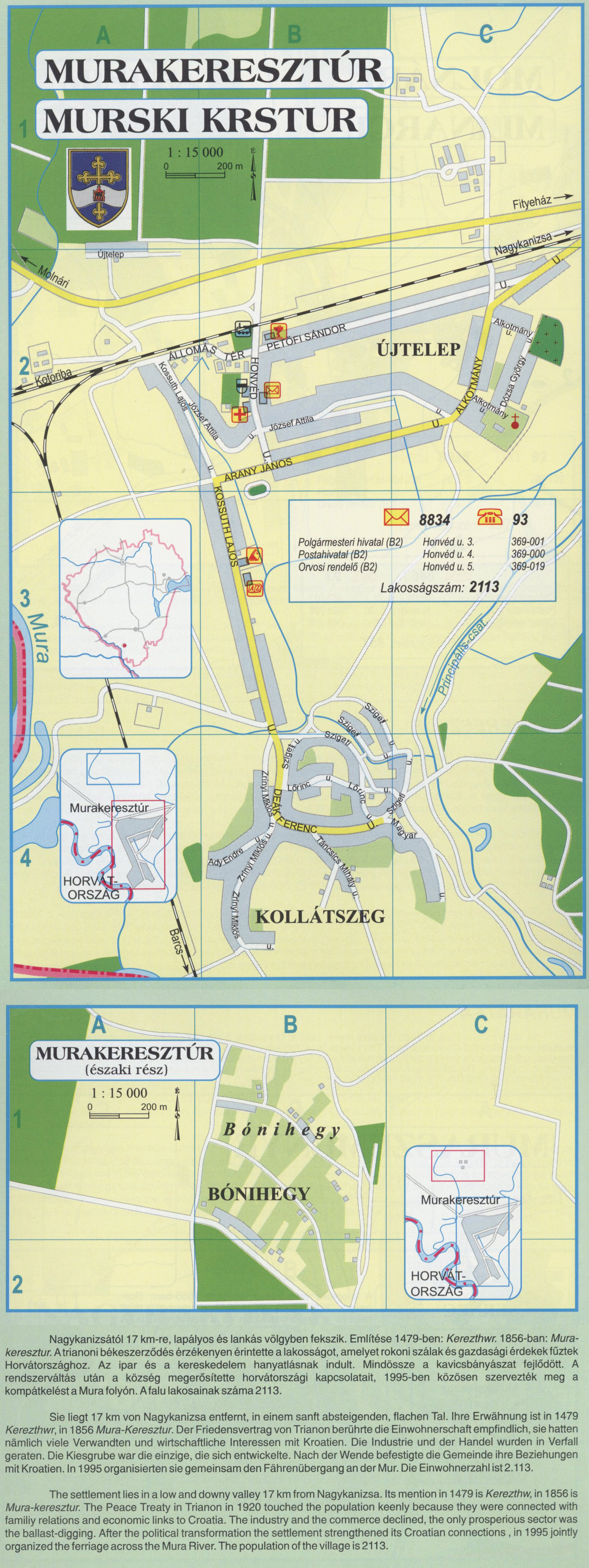 Nyilvános 2359 | 8814 | MURAKERESZTÚR | Nagykanizsától 17 km-re, lapályos és lankás völgyben fekszik. Említése 1479-ben: Kerezthwr. 1856-ban: Mura-keresztur. A trianoni békeszerződés érzékenyen érintette a lakosságot, amelyet rokoni szálak és gazdasági érdekek fűztek Horvátországhoz. Az ipar és a kereskedelem hanyatlásnak indult. Mindössze a kavicsbányászat fejlődött. A rendszerváltás után a község megerősítette horvátországi kapcsolatait, 1995-ben közösen szervezték meg a kompátkelést a Mura folyón. A falu lakosainak száma 2113. Sie liegt 17 km von Nagykanizsa entfernt, in einem sanft absteigenden, flachen Tal. Ihre Erwähnung ist in 1479 Kerezthwr, in 1856 Mura-Keresztur. Der Friedensvertrag von Trianon berührte die Einwohnerschaft empfindlich, sie hatten nämlich viele Verwandten und wirtschaftliche Interessen mit Kroatien. Die Industrie und der Handel wurden in Verfall geraten. Die Kiesgrube war die einzige, die sich entwickelte. Nach der Wende befestigte die Gemeinde ihre Beziehungen mit Kroatien. In 1995 organisierten sie gemeinsam den Fährenübergang an der Mur. Die Einwohnerzahl ist2.113. The settlement lies in a low and downy valley 17 km from Nagykanizsa. Its mention in 1479 is Kerezthw, in 1856 is Mura-keresztur. The Peace Treaty in Trianon in 1920 touched the population keenly because they were connected with familiy relations and economic links to Croatia. The industry and the commerce declined, the only prosperious sector was the ballast-digging. After the political transformation the settlement strengthened its Croatian connections , in 1995 jointly organized the ferriage across the Mura River. The population of the village is 2113. A részlet a következő kiadványból származik/Die Teile stammen vom volgenden Buch/This text came from the following book: Cím/Titel/Title: Zala megye településeinek atlasza - 257 település részletes térképe/Atlas der Komitat Zala - 257 Detailte Siedlungskarten/Zala county\'s Atlas - 257 settlement maps. Közreműködő/contributor: Lackner László (1943) (fotó) Kiadás/Ausgabe/Publisher: Gyula : HISZI-MAP, 1997 Sorozat/Serie/Series: Indulástól - megérkezésig... ETO: 912(439.121-2) ; 908.439.121 Cutter: Z 19 ISBN: 963-610-025-4 Oldalszám/Seiten/Pages: 323, 81 p. Megjegyzés/Note: Lezárva/Abgeschlossen am/Closed am: 1997. máj. 30. |