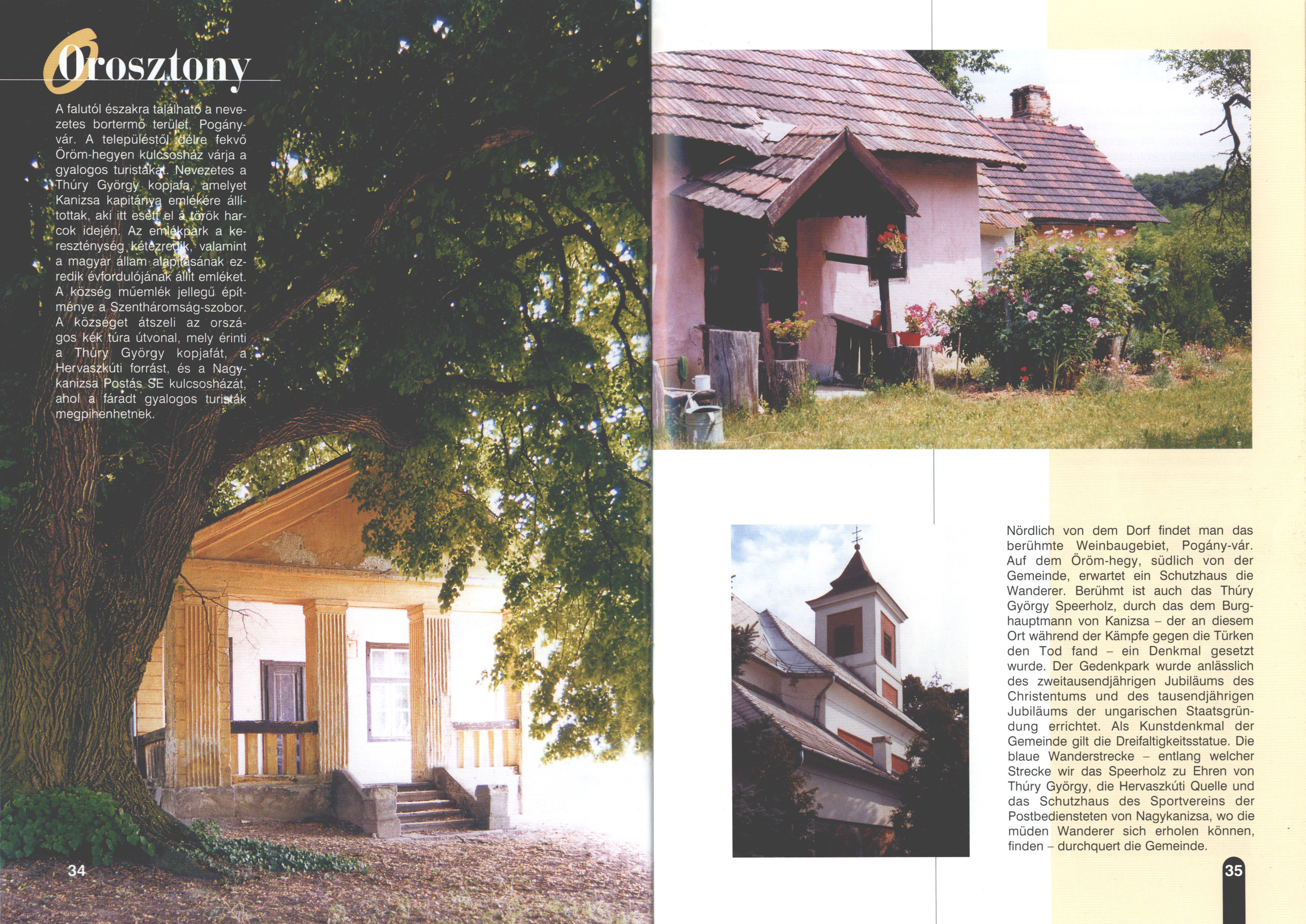 Nyilvános 2969 | 8990 | Orosztony | Nördlich von dem Dorf findet man das berühmte Weinbaugebiet, Pogány-vár. Auf dem Öröm-hegy, südlich von der Gemeinde, erwartet ein Schutzhaus die Wanderer. Berühmt ist auch das Thúry György Speerholz, durch das dem Burghauptmann von Kanizsa - der an diesem Ort während der Kämpfe gegen die Türken den Tod fand - ein Denkmal gesetzt wurde. Der Gedenkpark wurde anlässlich des zweitausendjährigen Jubiläums des Christentums und des tausendjährigen Jubiläums der ungarischen Staatsgründung errichtet. Als Kunstdenkmal der Gemeinde gilt die Dreifaltigkeitsstatue. Die blaue Wanderstrecke - entlang welcher Strecke wir das Speerholz zu Ehren von Thúry György, die Hervaszkúti Quelle und das Schutzhaus des Sportvereins der Postbediensteten von Nagykanizsa, wo die müden Wanderer sich erholen können, finden - durchquert die Gemeinde. Dieses Text stammt von: Titel: Hívogató a Régiók Kapujában - Útikönyv Látnivalók Nagykanizsán és Térségében (Einladend in dem Tor des Gebiets - Reisebuch - Sehenswürdigkeiten in Nagykanizsa und Umgebung) Herausgegeben von: Nagykanizsa és a Környező Települések Területfejlesztési Társulása (Verein für Gebietsentwicklung in Nagykanizsa und in ihrer Umgebung) 8800 Nagykanizsa, Petőfi Sándor út 5. Tel.: 06 93/536-453 • 06 93/536-454 Tel ./Fax: 06 93/326-323 E-mail: terstars@axelero.hu www.kanizsaterseg.celodin.hu |