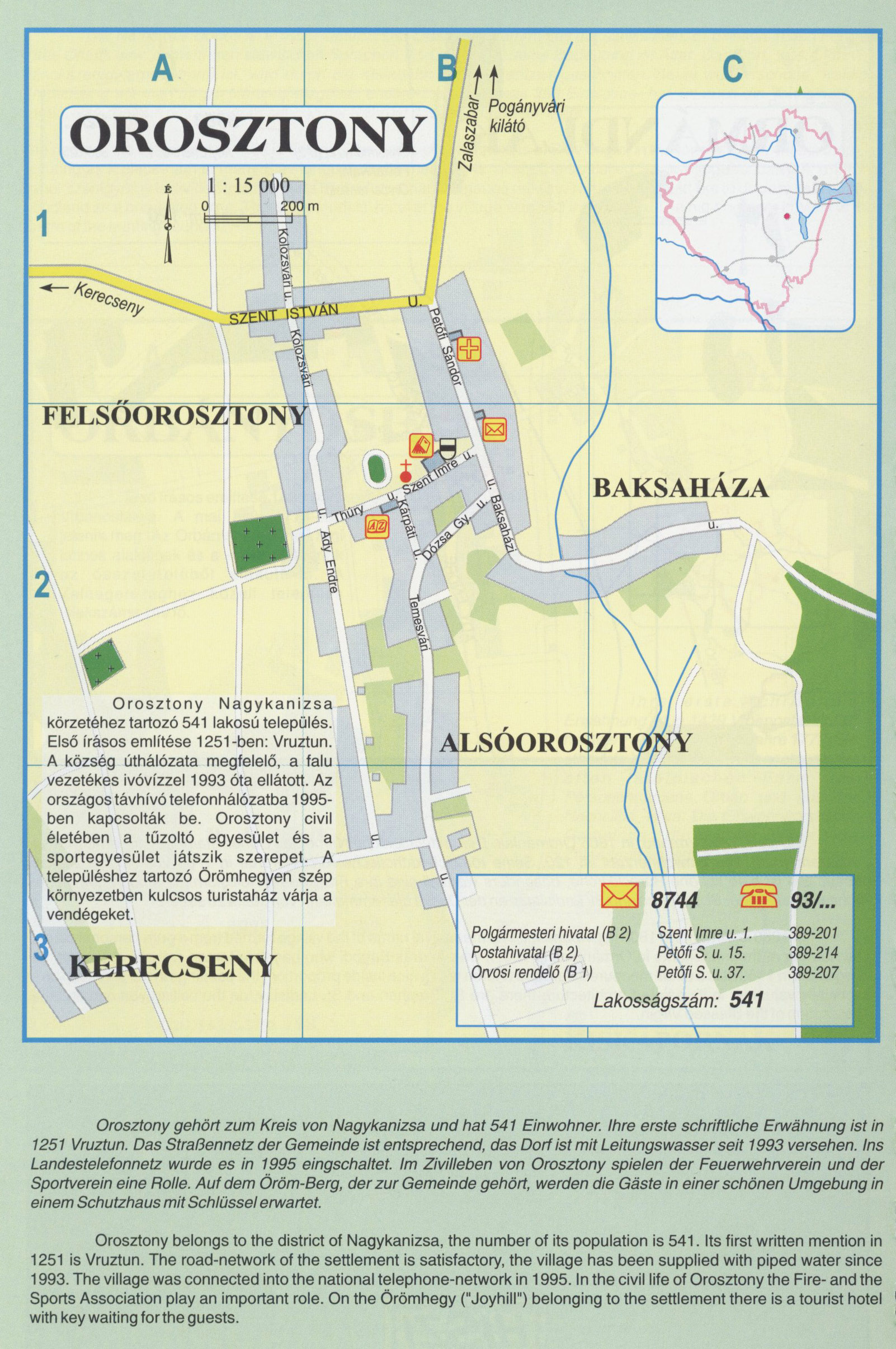 Nyilvános 3097 | 10773 | OROSZTONY | Orosztony Nagykanizsa körzetéhez tartozó 541 lakosú település. Első írásos említése 1251-ben: Vruztun. A község úthálózata megfelelő, a falu. vezetékes ivóvízzel 1993 óta ellátott. Az országos távhívó telefonhálózatba 1995-ben kapcsolták be. Orosztony civil életében a tűzoltó egyesület és a sportegyesület játszik szerepet. A településhez tartozó Örömhegyen szép környezetben kulcsos turistaház várja a vendégeket. Orosztony gehört zum Kreis von Nagykanizsa und hat 541 Einwohner. Ihre erste schriftliche Erwähnung ist in 1251 Vruztun. Das Straßennetz der Gemeinde ist entsprechend, das Dorf ist mit Leitungswasser seit 1993 versehen. Ins Landestelefonnetz wurde es in 1995 eingschaltet. Im Zivilleben von Orosztony spielen der Feuerwehrverein und der Sportverein eine Rolle. Auf dem Öröm-Berg, der zur Gemeinde gehört, werden die Gäste in einer schönen Umgebung in einem Schutzhaus mit Schlüssel erwartet. Orosztony belongs to the district of Nagykanizsa, the number of its population is 541. Its first written mention in 1251 is Vruztun. The road-network of the settlement is satisfactory, the village has been supplied with piped water since 1993. The village was connected into the national telephone-network in 1995. In the civil life of Orosztony the Fire- and the Sports Association play an important role. On the Örömhegy ("Joyhill") belonging to the settlement there is a tourist hotel with key waiting forthe guests. A részlet a következő kiadványból származik/Die Teile stammen vom volgenden Buch/This text came from the following book: Cím/Titel/Title: Zala megye településeinek atlasza - 257 település részletes térképe/Atlas der Komitat Zala - 257 Detailte Siedlungskarten/Zala county\'s Atlas - 257 settlement maps. Közreműködő/contributor: Lackner László (1943) (fotó) Kiadás/Ausgabe/Publisher: Gyula : HISZI-MAP, 1997 Sorozat/Serie/Series: Indulástól - megérkezésig... ETO: 912(439.121-2) ; 908.439.121 Cutter: Z 19 ISBN: 963-610-025-4 Oldalszám/Seiten/Pages: 323, 81 p. Megjegyzés/Note: Lezárva/Abgeschlossen am/Closed am: 1997. máj. 30. |