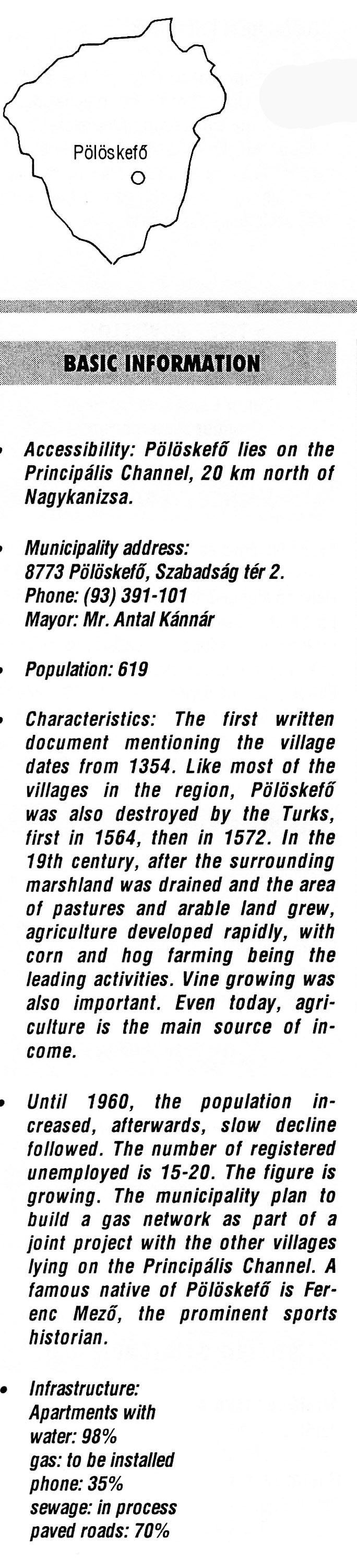 Nyilvános 2831 | 6997 | Pölöskefő | BASIC INFORMATION Accessibility: Pölöskefő lies on the Principális Channel, 20 km north of Nagykanizsa. Municipality address: 8773 Pölöskefő, Szabadság tér 2. Phone: (93) 391-101 Mayor: Mr. Antal Kánnár Population: 619 Characteristics: The first written document mentioning the village dates from 1354. Like most of the villages in the region, Pölöskefő was also destroyed by the Turks, first in 1564, then in 1572. In the 19th century, after the surrounding marshland was drained and the area of pastures and arable land grew, agriculture developed rapidly, with corn and hog farming being the leading activities. Vine growing was also important. Even today, agriculture is the main source of income. Until 1960, the population increased, afterwards, slow decline followed. The number of registered unemployed is 15-20. The figure is growing. The municipality plan to build a gas network as part of a joint project with the other villages lying on the Principális Channel. A famous native of Pölöskefő is Ferenc Mező, the prominent sports historian. Infrastructure: Apartments with water: 98% gas: to be installed phone: 35% sewage: in process paved roads: 70% This text came from the following book: Title: Handbook of Zala county (Zala megye kézikönyve) Series: County handbooks of Hungary (Magyarország megyei kézikönyvei) Chief editor: Hóbor József Publisher: (Hatvan), CEBA-Hungary Ltd, 1998 ETO: 908.439.121(035) ; 050.8(439.121) ISBN: 963-9089-18-2 Pages: 488-1040 p. Remark: Closed on: 1998. márc. 31. |