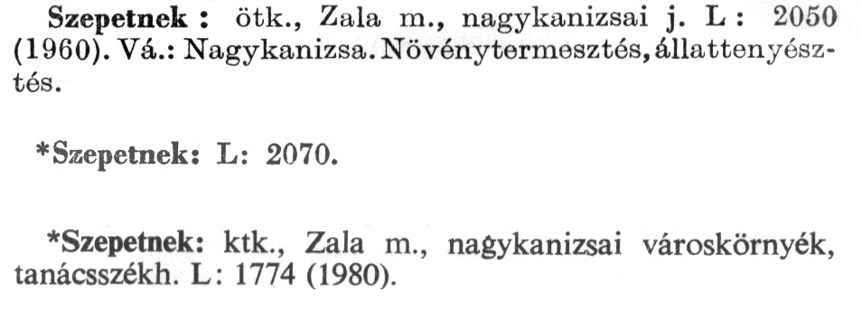 Nyilvános 2455 | 6065 | A szócikkek felismertetett szövege: | (Az első csillag után az 1972-es, a második csillag után az 1981-es kiadású kiegészítő kötetből származó szöveg következik) Szepetnek: ötk., Zala m., nagykanizsai j. L: 2050 (1960). Vá.: Nagykanizsa. Növénytermesztés, állattenyésztés. *Szepetnek: L: 2070. *Szepetnek: ktk., Zala m., nagykanizsai városkörnyék, tanácsszékh. L: 1774 (1980). A szócikkek a következő lexikonból származnak: Cím: Új magyar lexikon Közreműködő: Berei Andor (1900-1979) (szerk.) Szerz. közl.: [szerk. Berei Andor et al.] Kiadás jelzés: 2. lny. Kiadás: Budapest : Akad. K., 1961-1962 Kötetei: 1., A - C 2., D - F 3., G - J 4., K - Me 5., Mf - R 6., S - Z 7. köt., A-Z Kiegészítő kötet (1972) Kiegészítő kötet, 1962÷1980 (1981) ETO jelzet: 03=945.11 Szakjelzet: 030 Cutter: U 28 Nyelv: magyar Megjegyzés: Bibliogr. a címszavak egy részének végén |