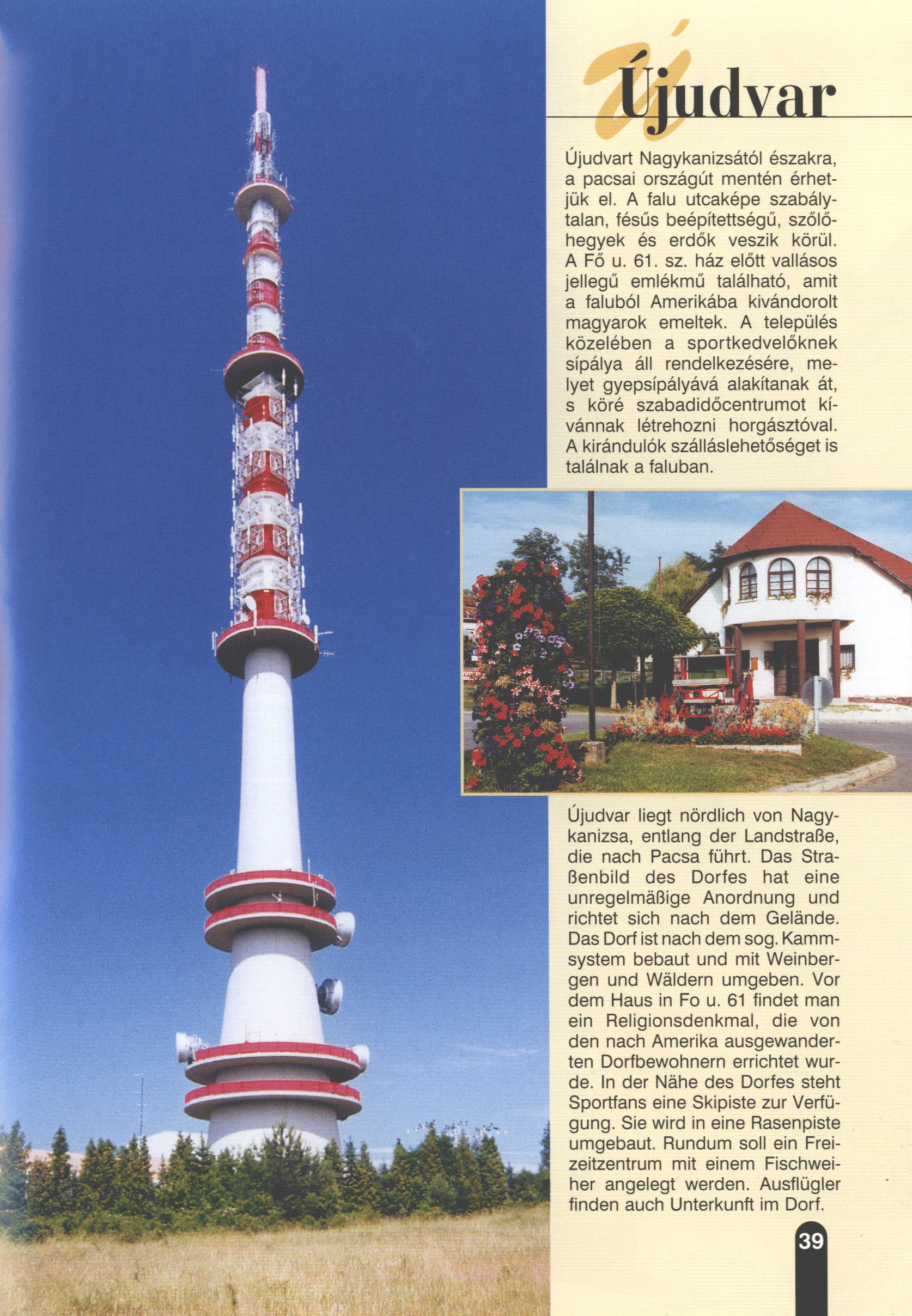 Nyilvános 2731 | 6833 | Újudvar | Újudvar liegt nördlich von Nagykanizsa, entlang der Landstraße, die nach Pacsa führt. Das Straßenbild des Dorfes hat eine unregelmäßige Anordnung und richtet sich nach dem Gelände. Das Dorf ist nach dem sog. Kammsystem bebaut und mit Weinbergen und Wäldern umgeben. Vor dem Haus in Fo u. 61 findet man ein Religionsdenkmal, die von den nach Amerika ausgewanderten Dorfbewohnern errichtet wurde. In der Nähe des Dorfes steht Sportfans eine Skipiste zur Verfügung. Sie wird in eine Rasenpiste umgebaut. Rundum soll ein Freizeitzentrum mit einem Fischweiher angelegt werden. Ausflügler finden auch Unterkunft im Dorf. Dieses Text stammt von: Titel: Hívogató a Régiók Kapujában - Útikönyv Látnivalók Nagykanizsán és Térségében (Einladend in dem Tor des Gebiets - Reisebuch - Sehenswürdigkeiten in Nagykanizsa und Umgebung) Herausgegeben von: Nagykanizsa és a Környező Települések Területfejlesztési Társulása (Verein für Gebietsentwicklung in Nagykanizsa und in ihrer Umgebung) 8800 Nagykanizsa, Petőfi Sándor út 5. Tel.: 06 93/536-453 • 06 93/536-454 Tel ./Fax: 06 93/326-323 E-mail: terstars@axelero.hu www.kanizsaterseg.celodin.hu |