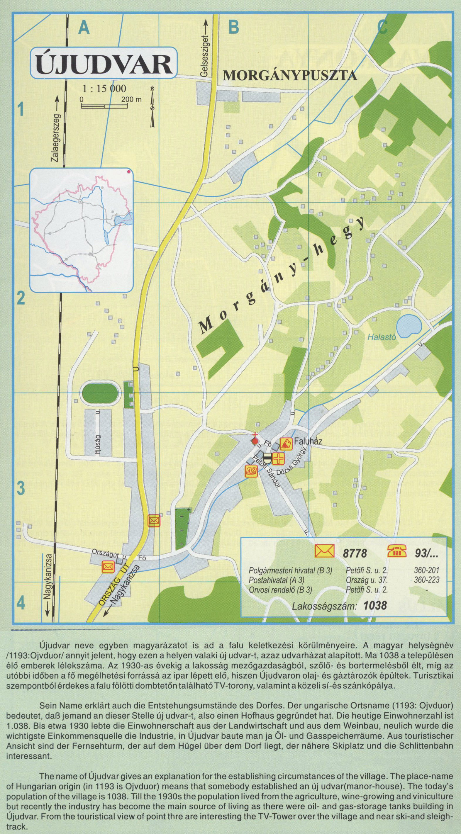 Nyilvános 2616 | 6413 | ÚJUDVAR | Újudvar neve egyben magyarázatot is ad a falu keletkezési körülményeire. A magyar helységnév /1193:Ojvduor/ annyit jelent, hogy ezen a helyen valaki új udvar-t, azaz udvarházat alapított. Ma 1038 a településen élő emberek lélekszáma. Az 1930-as évekig a lakosság mezőgazdaságból, szőlő- és bortermelésből élt, míg az utóbbi időben a fő megélhetési forrássá az ipar lépett elő, hiszen Újudvaron olaj- és gáztározók épültek. Turisztikai szempontból érdekes a falu fölötti dombtetőn található TV-torony, valamint a közeli sí-és szánkópálya. Sein Name erklärt auch die Entstehungsumstände des Dorfes. Der ungarische Ortsname (1193: Ojvduor) bedeutet, daß jemand an dieser Stelle új udvar-t, also einen Hofhaus gegründet hat. Die heutige Einwohnerzahl ist 1.038. Bis etwa 1930 lebte die Einwohnerschaft aus der Landwirtschaft und aus dem Weinbau, neulich wurde die wichtigste Einkommensquelle die Industrie, in Újudvar baute man ja Öl- und Gasspeicherräume. Aus touristischer Ansicht sind der Fernsehturm, der auf dem Hügel über dem Dorf liegt, der nähere Skiplatz und die Schlittenbahn interessant. The name of Újudvar gives an explanation for the establishing circumstances of the village. The place-name of Hungarian origin (in 1193 is Ojvduor) means that somebody established an új udvar(manor-house). The today\'s population of the village is 1038. Till the 1930s the population lived from the agriculture, wine-growing and viniculture but recently the industry has become the main source of living as there were oil- and gas-storage tanks building in Újudvar. From the touristical view of point thre are interesting the TV-Tower over the village and near ski-and sleigh-track. A részlet a következő kiadványból származik/Die Teile stammen vom volgenden Buch/This text came from the following book: Cím/Titel/Title: Zala megye településeinek atlasza - 257 település részletes térképe/Atlas der Komitat Zala - 257 Detailte Siedlungskarten/Zala county\'s Atlas - 257 settlement maps. Közreműködő/contributor: Lackner László (1943) (fotó) Kiadás/Ausgabe/Publisher: Gyula : HISZI-MAP, 1997 Sorozat/Serie/Series: Indulástól - megérkezésig... ETO: 912(439.121-2) ; 908.439.121 Cutter: Z 19 ISBN: 963-610-025-4 Oldalszám/Seiten/Pages: 323, 81 p. Megjegyzés/Note: Lezárva/Abgeschlossen am/Closed am: 1997. máj. 30. |