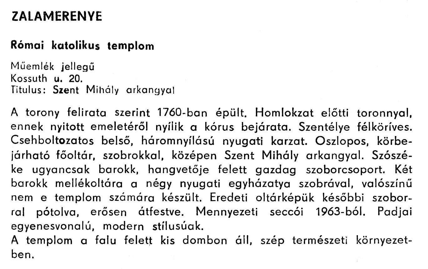 Nyilvános 2133 | 5005 | Rövid leírás | Teljes leírás (1.52 KB) | Zalamerenye - Zala megye műemlékei 1979 119old A részlet szövege: ZALAMERENYE Római katolikus templom Műemlék jellegű Kossuth u. 20. Titulus: Szent Mihály arkangyal A torony felirata szerint 1760-ban épült. Homlokzat előtti toronnyal, ennek nyitott emeletéről nyílik a kórus bejárata. Szentélye félköríves. Csehboltozatos belső, háromnyílású nyugati karzat. Oszlopos, körbejárható főoltár, szobrokkal, középen Szent Mihály arkangyal. Szószéke ugyancsak barokk, hangvetője felett gazdag szoborcsoport. Két barokk mellékoltára a négy nyugati egyházatya szobrával, valószínű nem e templom számára készült. Eredeti oltárképük későbbi szoborral pótolva, erősen átfestve. Mennyezeti seccói 1963-ból. Padjai egyenesvonalú, modern stílusúak. A templom a falu felett kis dombon áll, szép természeti környezetben. A részlet a következő könyvből származik: Cím: Zala megye műemlékei Szerző: Németh József (1928) Közreműködő: Vándor László (szerk.) ; Szabóky Zsolt (1941) (fotó) Szerz. közl.: Németh József ; [szerk. Vándor László] ; [fotók... Szabóky Zsolt] Kiadás jelzés: 2. bőv. kiad. Kiadás: Zalaegerszeg : Zalai Ny., 1979 ETO jelzet: 72(439.121) ; 7.025.3/.4(439.121) ; 908.439.121 Tárgyszó: Zala Szakjelzet: 908 Cutter: N 53 Nyelv: magyar Oldalszám: 134 p. |