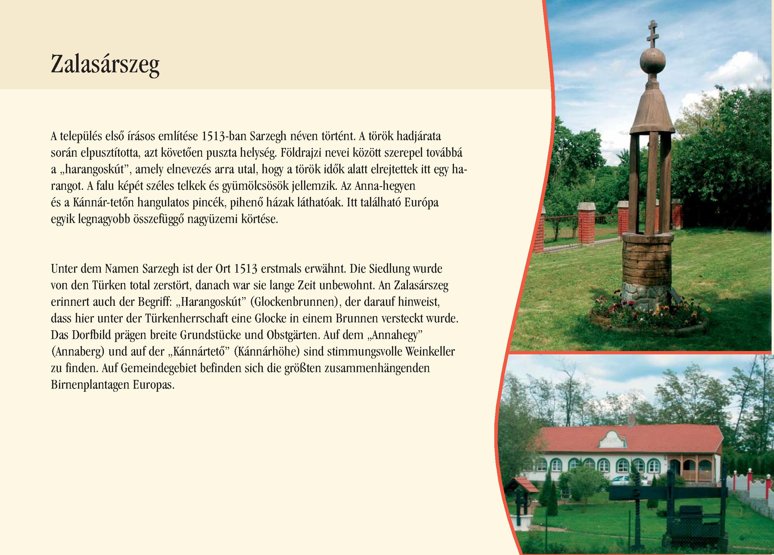 Nyilvános 2688 | 7009 | Rövid leírás | Teljes leírás (840 B) | Zalasárszeg Unter dem Namen Sarzegh ist der Ort 1513 erstmals erwähnt. Die Siedlung wurde von den Türken total zerstört, danach war sie lange Zeit unbewohnt. An Zalasárszeg erinnert auch der Begriff: ,,Harangoskút" (Glockenbrunnen), der darauf hinweist, dass hier unter der Türkenherrschaft eine Glocke in einem Brunnen versteckt wurde. Das Dorfbild prägen breite Grundstücke und Obstgärten. Auf dem ,,Annahegy" (Annaberg) und auf der ,,Kánnártető" (Kánnárhöhe) sind stimmungsvolle Weinkeller zu finden. Auf Gemeindegebiet befinden sich die größten zusammenhängenden Birnenplantagen Europas. Dieses Text stammt von: Pannonhát tájpark prospektus 2006. Web: http://www.pannonhat.hu/ (auch in Deutsch) |