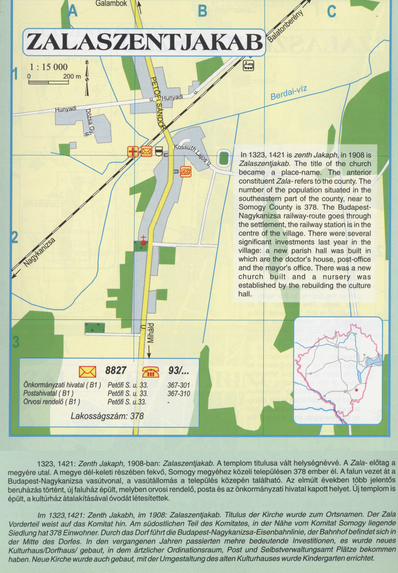Nyilvános 2377 | 7384 | Rövid leírás | Teljes leírás (2.63 KB) | ZALASZENTJAKAB 1323, 1421: Zenth Jakaph, 1908-ban: Zalaszentjakab. A templom titulusa vált helységnévvé. A Zala- előtag a megyére utal. A megye dél-keleti részében fekvő, Somogy megyéhez közeli településen 378 ember él. A falun vezet át a Budapest-Nagykanizsa vasútvonal, a vasútállomás a település közepén található. Az elmúlt években több jelentős beruházás történt, új faluház épült, melyben orvosi rendelő, posta és az önkormányzati hivatal kapott helyet. Új templom is épült, a kultúrház átalakításával óvodát létesítettek. lm 1323,1421: Zenth Jakabh, im 1908: Zalaszentjakab. Titulus der Kirche wurde zum Ortsnamen. Der Zala Vorderteil weist auf das Komitat hin. Am südostlichen Teil des Komitates, in der Nähe vom Komitat Somogy liegende Siedlung hat 378 Einwohner. Durch das Dorf führt die Budapest-Nagykanizsa-Eisenbahnlinie, der Bahnhof befindet sich in der Mitte des Dorfes. In den vergangenen Jahren passierten mehre bedeutende Investitionen, es wurde neues Kulturhaus/Dorfhaus/ gebaut, in dem ärtzlicher Ordinationsraum, Post und Selbstverwaltungsamt Plätze bekommen haben. Neue Kirche wurde auch gebaut, mit der Umgestaltung des alten Kulturhauses wurde Kindergarten errichtet. In 1323,1421 is zenth Jakaph, in 1908 is Zalaszentjakab. The title of the church became a place-name. The anterior constituent Zala- refers to the county. The number of the population situated in the southeastern part of the county, near to Somogy County is 378. The Budapest-Nagykanizsa railway-route goes through the settlement, the railway station is in the centre of the village. There were several significant investments last year in the village: a new parish hall was built in which are the doctor\'s house, post-office and the mayor\'s office. There was a new church built and a nursery was established by the rebuilding the culture hall. A részlet a következő kiadványból származik/Die Teile stammen vom volgenden Buch/This text came from the following book: Cím/Titel/Title: Zala megye településeinek atlasza - 257 település részletes térképe/Atlas der Komitat Zala - 257 Detailte Siedlungskarten/Zala county\'s Atlas - 257 settlement maps. Közreműködő/contributor: Lackner László (1943) (fotó) Kiadás/Ausgabe/Publisher: Gyula : HISZI-MAP, 1997 Sorozat/Serie/Series: Indulástól - megérkezésig... ETO: 912(439.121-2) ; 908.439.121 Cutter: Z 19 ISBN: 963-610-025-4 Oldalszám/Seiten/Pages: 323, 81 p. Megjegyzés/Note: Lezárva/Abgeschlossen am/Closed am: 1997. máj. 30. |