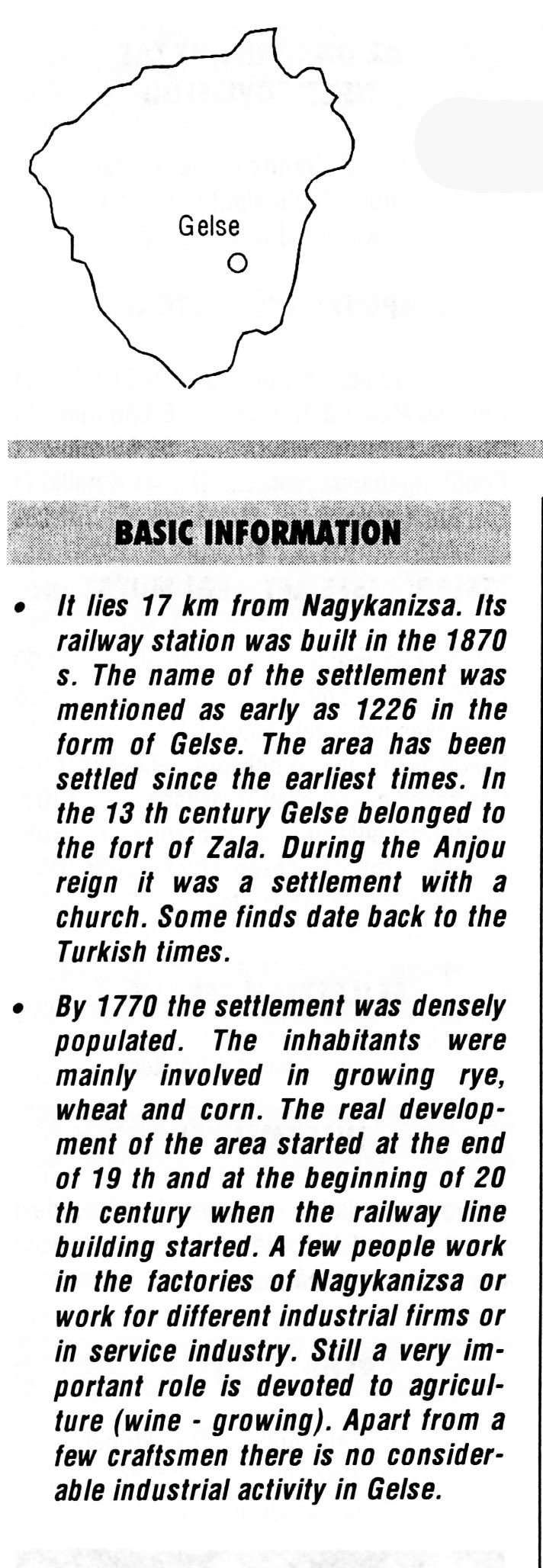 Nyilvános 2642 | 7385 | Gelse | BASIC INFORMATION It lies 17 km from Nagykanizsa. Its railway station was built in the 1870 s. The name of the settlement was mentioned as early as 1226 in the form of Gelse. The area has been settled since the earliest times. In the 13 th century Gelse belonged to the fort of Zala. During the Anjou reign it was a settlement with a church. Some finds date back to the Turkish times. By 1770 the settlement was densely populated. The inhabitants were mainly involved in growing rye, wheat and corn. The real development of the area started at the end of 19 th and at the beginning of 20 th century when the railway line building started. A few people work in the factories of Nagykanizsa or work for different industrial firms or in service industry. Still a very important role is devoted to agriculture (wine - growing). Apart from a few craftsmen there is no considerable industrial activity in Gelse. This text came from the following book: Title: Handbook of Zala county (Zala megye kézikönyve) Series: County handbooks of Hungary (Magyarország megyei kézikönyvei) Chief editor: Hóbor József Publisher: (Hatvan), CEBA-Hungary Ltd, 1998 ETO: 908.439.121(035) ; 050.8(439.121) ISBN: 963-9089-18-2 Pages: 488-1040 p. Remark: Closed on: 1998. márc. 31. |