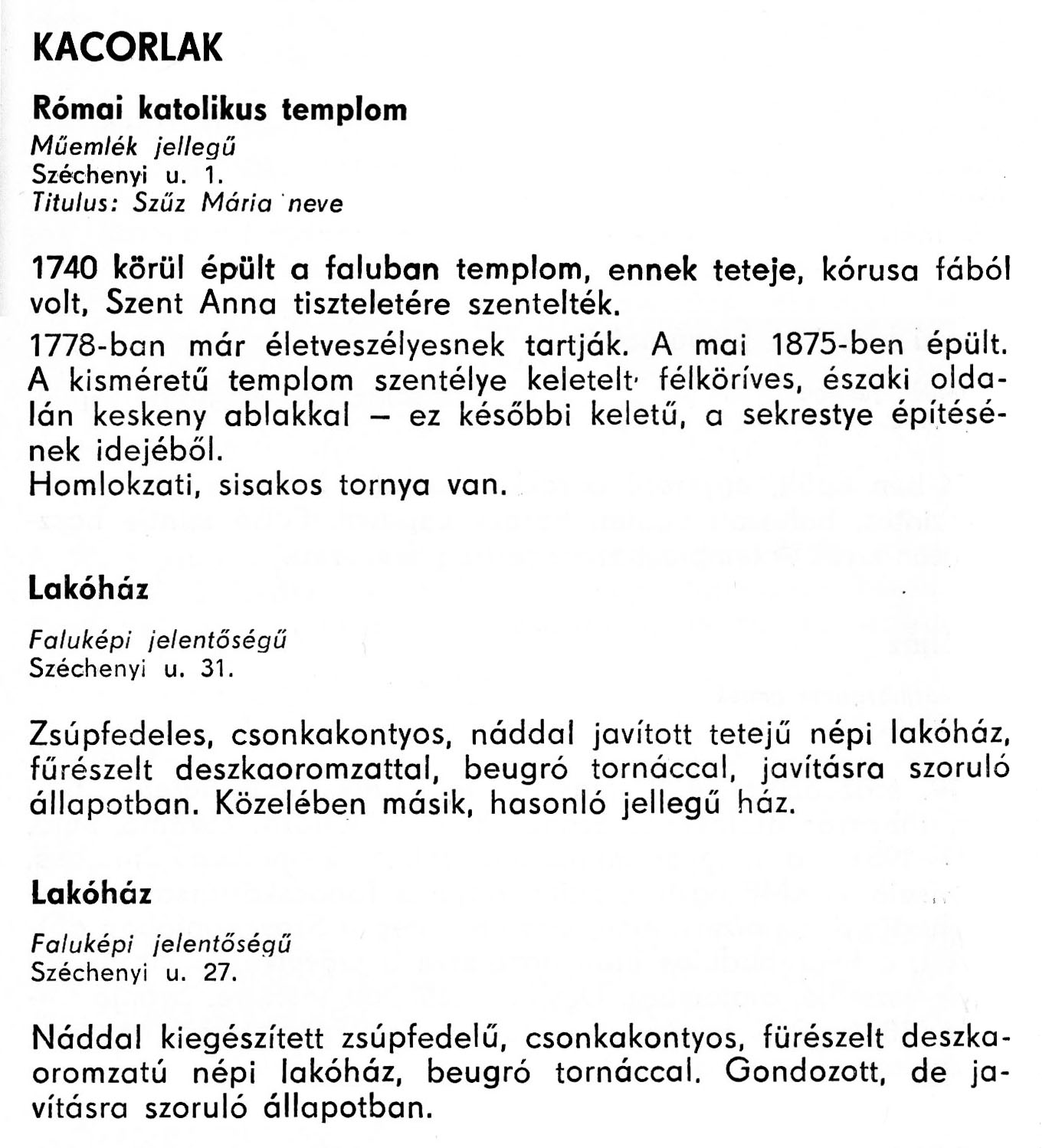 Nyilvános 2882 | 8128 | Rövid leírás | Teljes leírás (1.62 KB) | Kacorlak - Zala megye műemlékei 1977 061-062old A részlet szövege: KACORLAK Római katolikus templom Műemlék jellegű Széchenyi u. 1. Titulus: Szűz Mária neve 1740 körül épült a faluban templom, ennek teteje, kórusa fából volt, Szent Anna tiszteletére szentelték. 1778-ban már életveszélyesnek tartják. A mai 1875-ben épült. A kisméretű templom szentélye keletelt, félköríves, északi oldalán keskeny ablakkal - ez későbbi keletű, a sekrestye építésének idejéből. Homlokzati, sisakos tornya van. Lakóház Faluképi jelentőségű Széchenyi u. 31. Zsúpfedeles, csonkakontyos, náddal javított tetejű népi lakóház, fűrészelt deszkaoromzattal, beugró tornáccal, javításra szoruló állapotban. Közelében másik, hasonló jellegű ház. Lakóház Faluképi jelentőségű Széchenyi u. 27. Náddal kiegészített zsúpfedelű, csonkakontyos, fűrészelt deszka-oromzatú népi lakóház, beugró tornáccal. Gondozott, de javításra szoruló állapotban. A részlet a következő könyvből származik: Cím: Zala megye műemlékei Szerző: Németh József (1928) Közreműködő: Lantos Miklós (fotó) Szerz. közl.: Németh József ; [fotók... Lantos Miklós] Kiadás: Zalaegerszeg : Zalai Ny., 1977 ETO jelzet: 72(439.121) ; 7.025.3/.4 ; 908.439.121 Tárgyszó: Zala megye Szakjelzet: 908 Cutter: N 53 Nyelv: magyar Oldalszám: 109 p. |