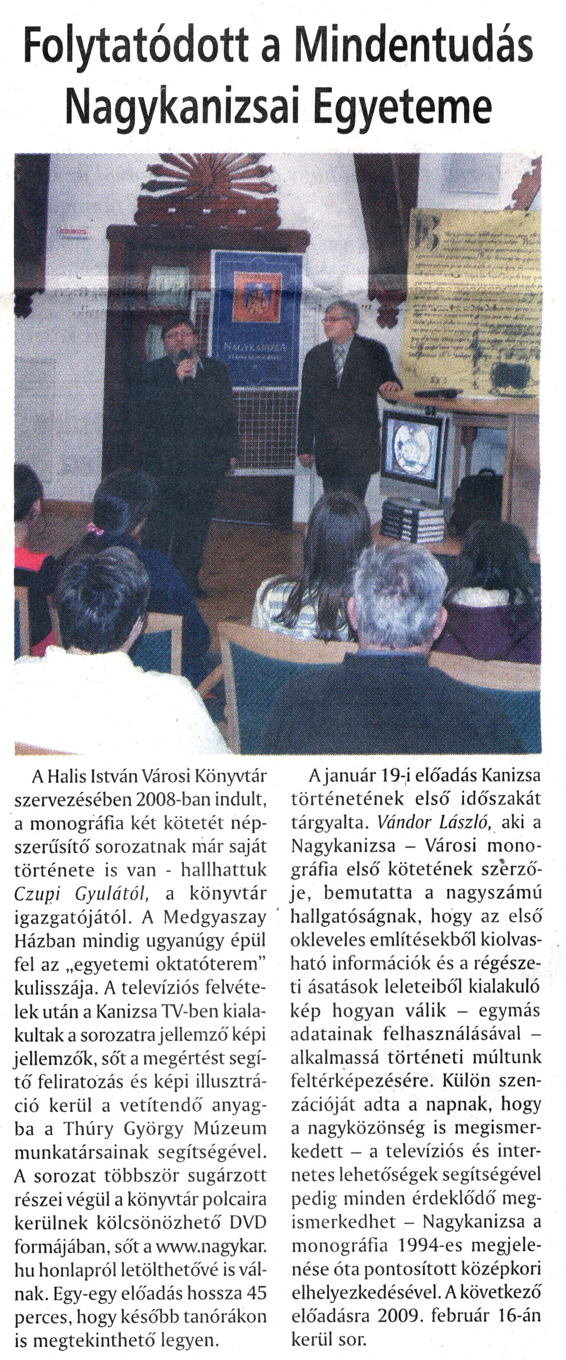 Nyilvános 2800 | 4736 | Rövid leírás | Teljes leírás (1.8 KB) | Nagykanizsai Maraton 2009. január 22. 3. szám 3. oldal Folytatódott a Mindentudás Nagykanizsai Egyeteme A cikk szövege: Folytatódott a Mindentudás Nagykanizsai Egyeteme A Halis István Városi Könyvtár szervezésében 2008-ban indult, a monográfia két kötetét népszerűsítő sorozatnak már saját története is van - hallhattuk Czupi Gyulától, a könyvtár igazgatójától. A Medgyaszay Házban mindig ugyanúgy épül fel az „egyetemi oktatóterem" kulisszája. A televíziós felvételek után a Kanizsa TV-ben kialakultak a sorozatra jellemző képi jellemzők, sőt a megértést segítő feliratozás és képi illusztráció kerül a vetítendő anyagba a Thúry György Múzeum munkatársainak segítségével. A sorozat többször sugárzott részei végül a könyvtár polcaira kerülnek kölcsönözhető DVD formájában, sőt a www.nagykar. hu honlapról letölthetővé is válnak. Egy-egy előadás hossza 45 perces, hogy később tanórákon is megtekinthető legyen. A január 19-i előadás Kanizsa történetének első időszakát tárgyalta. Vándor László, aki a Nagykanizsa - Városi monográfia első kötetének szerzője, bemutatta a nagyszámú hallgatóságnak, hogy az első okleveles említésekből kiolvasható információk és a régészeti ásatások leleteiből kialakuló kép hogyan válik - egymás adatainak felhasználásával -alkalmassá történeti múltunk feltérképezésére. Külön szenzációját adta a napnak, hogy a nagyközönség is megismerkedett - a televíziós és internetes lehetőségek segítségével pedig minden érdeklődő megismerkedhet - Nagykanizsa a monográfia 1994-es megjelenése óta pontosított középkori elhelyezkedésével. A következő előadásra 2009. február 16-án kerül sor. |