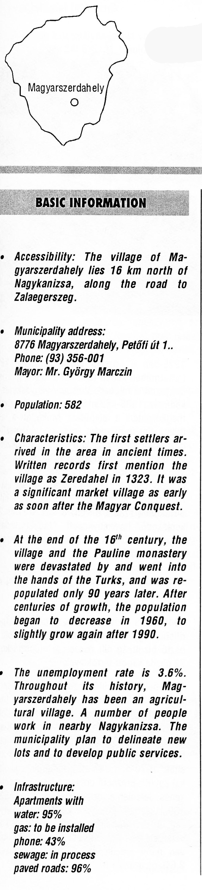Nyilvános 2887 | 7303 | Magyarszerdahely | BASIC INFORMATION Accessibility: The village of Magyarszerdahely lies 16 km north of Nagykanizsa, along the road to Zalaegerszeg. Municipality address: 8776 Magyarszerdahely, Petőfi út 1. Phone: (93) 356-001 Mayor: Mr. György Marczin Population: 582 Characteristics: The first settlers arrived in the area in ancient times. Written records first mention the village as Zeredahel in 1323. It was a significant market village as early as soon after the Magyar Conquest. At the end of the 16th century, the village and the Pauline monastery were devastated by and went into the hands of the Turks, and was repopulated only 90 years later. After centuries of growth, the population began to decrease in 1960, to slightly grow again after 1990. The unemployment rate is 3.6%. Throughout its history, Magyarszerdahely has been an agricultural village. A number of people work in nearby Nagykanizsa. The municipality plan to delineate new lots and to develop public services. Infrastructure: Apartments with water: 95% gas: to be installed phone: 43% sewage: in process paved roads: 96% This text came from the following book: Title: Handbook of Zala county (Zala megye kézikönyve) Series: County handbooks of Hungary (Magyarország megyei kézikönyvei) Chief editor: Hóbor József Publisher: (Hatvan), CEBA-Hungary Ltd, 1998 ETO: 908.439.121(035) ; 050.8(439.121) ISBN: 963-9089-18-2 Pages: 488-1040 p. Remark: Closed on: 1998. márc. 31. |